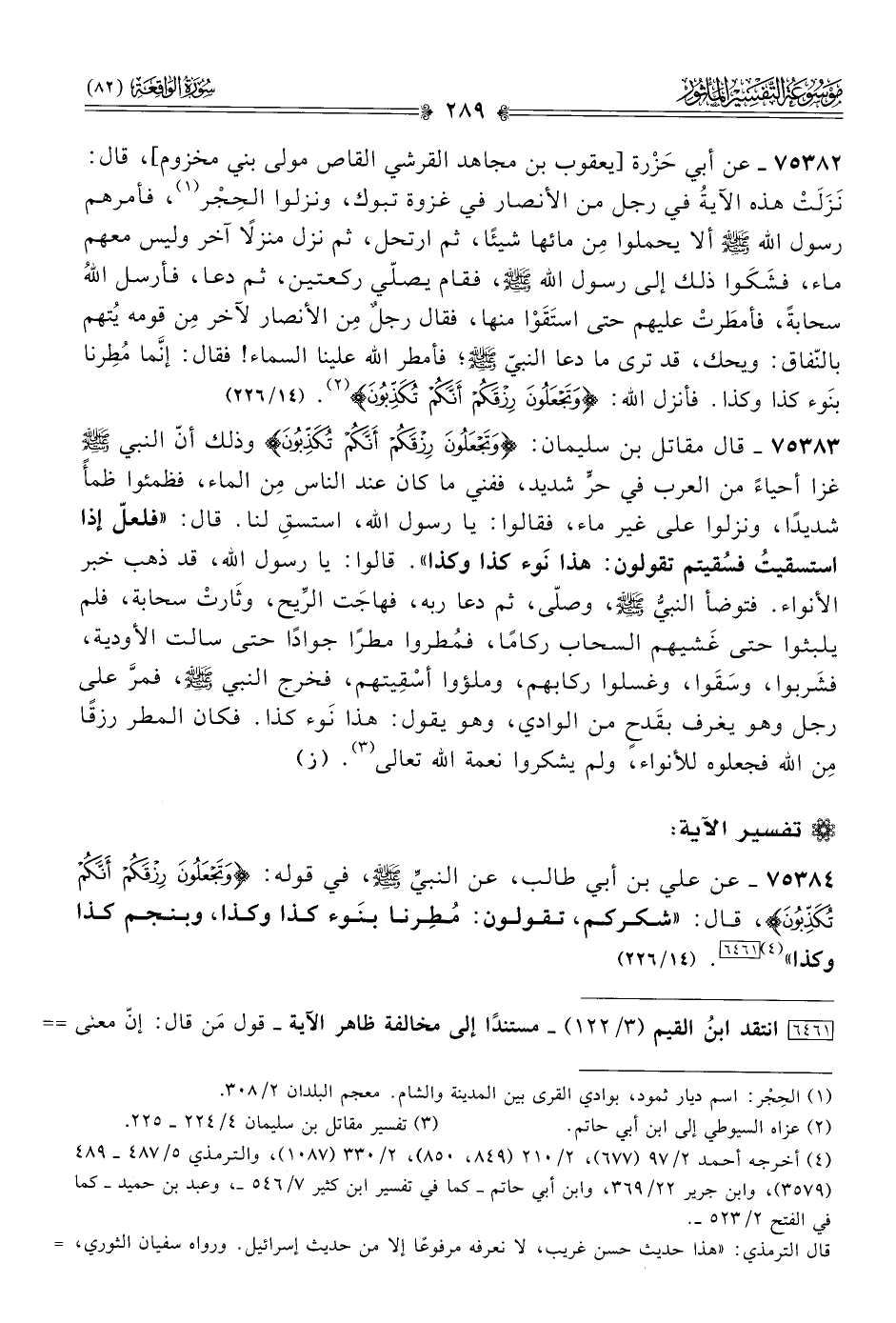 ٧٥٣٨٢ - عن أبي حَزْرة [يعقوب بن مجاهد القرشي القاص مولى بني مخزوم]، قال: نَزَلَتْ هذه الآيةُ في رجل من الأنصار في غزوة تبوك، ونزلوا الحِجْر (¬١)، فأمرهم رسول الله - صلى الله عليه وسلم - ألا يحملوا مِن مائها شيئًا، ثم ارتحل، ثم نزل منزلًا آخر وليس معهم ماء، فشَكَوا ذلك إلى رسول الله - صلى الله عليه وسلم -، فقام يصلّي ركعتين، ثم دعا، فأرسل اللهُ سحابةً، فأمطَرتْ عليهم حتى استَقَوْا منها، فقال رجلٌ مِن الأنصار لآخر مِن قومه يُتهم بالنّفاق: ويحك، قد ترى ما دعا النبيّ - صلى الله عليه وسلم -؛ فأمطر الله علينا السماء! فقال: إنّما مُطِرنا بنَوء كذا وكذا. فأنزل الله: {وتَجْعَلُونَ رِزْقَكُمْ أنَّكُمْ تُكَذِّبُونَ} (¬٢). (١٤/ ٢٢٦)