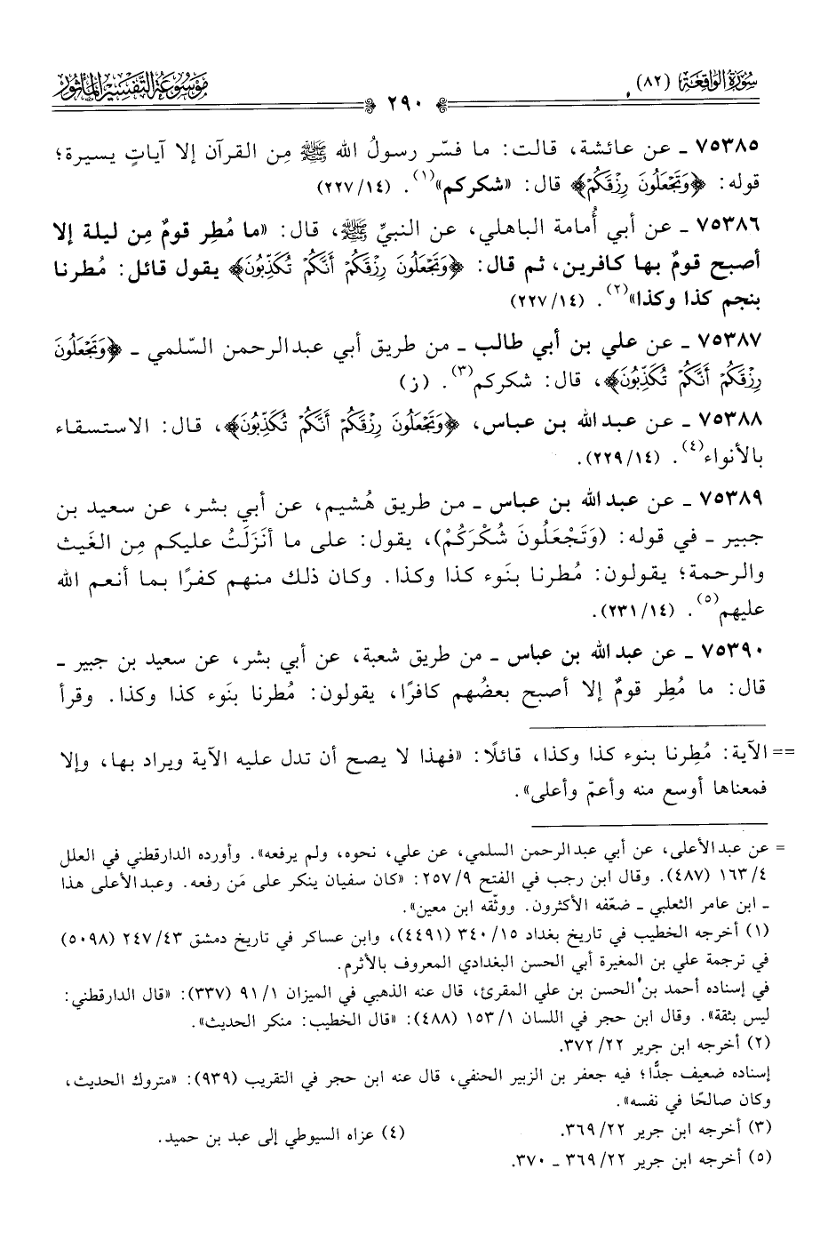 ٧٥٣٩٠ - عن عبد الله بن عباس -من طريق شعبة، عن أبي بشر، عن سعيد بن جبير- قال: ما مُطِر قومٌ إلا أصبح بعضُهم كافرًا، يقولون: مُطرنا بنَوء كذا وكذا. وقرأ