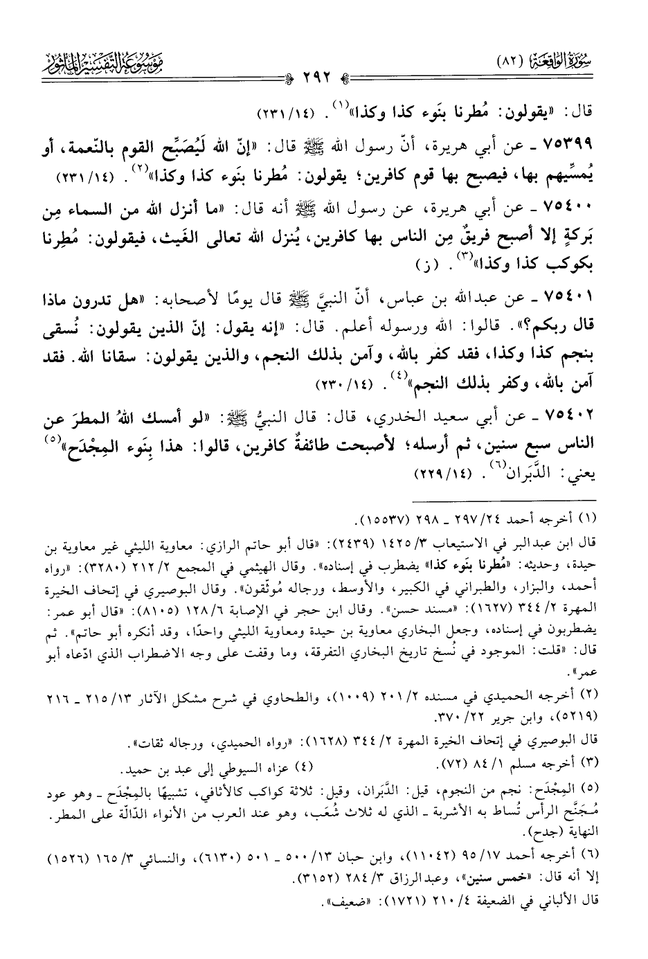 ٧٥٣٩٩ - عن أبي هريرة، أنّ رسول الله - صلى الله عليه وسلم - قال: «إنّ الله لَيُصَبِّح القوم بالنّعمة، أو يُمسِّيهم بها، فيصبح بها قوم كافرين؛ يقولون: مُطرنا بنَوء كذا وكذا» (¬٢). (١٤/ ٢٣١)