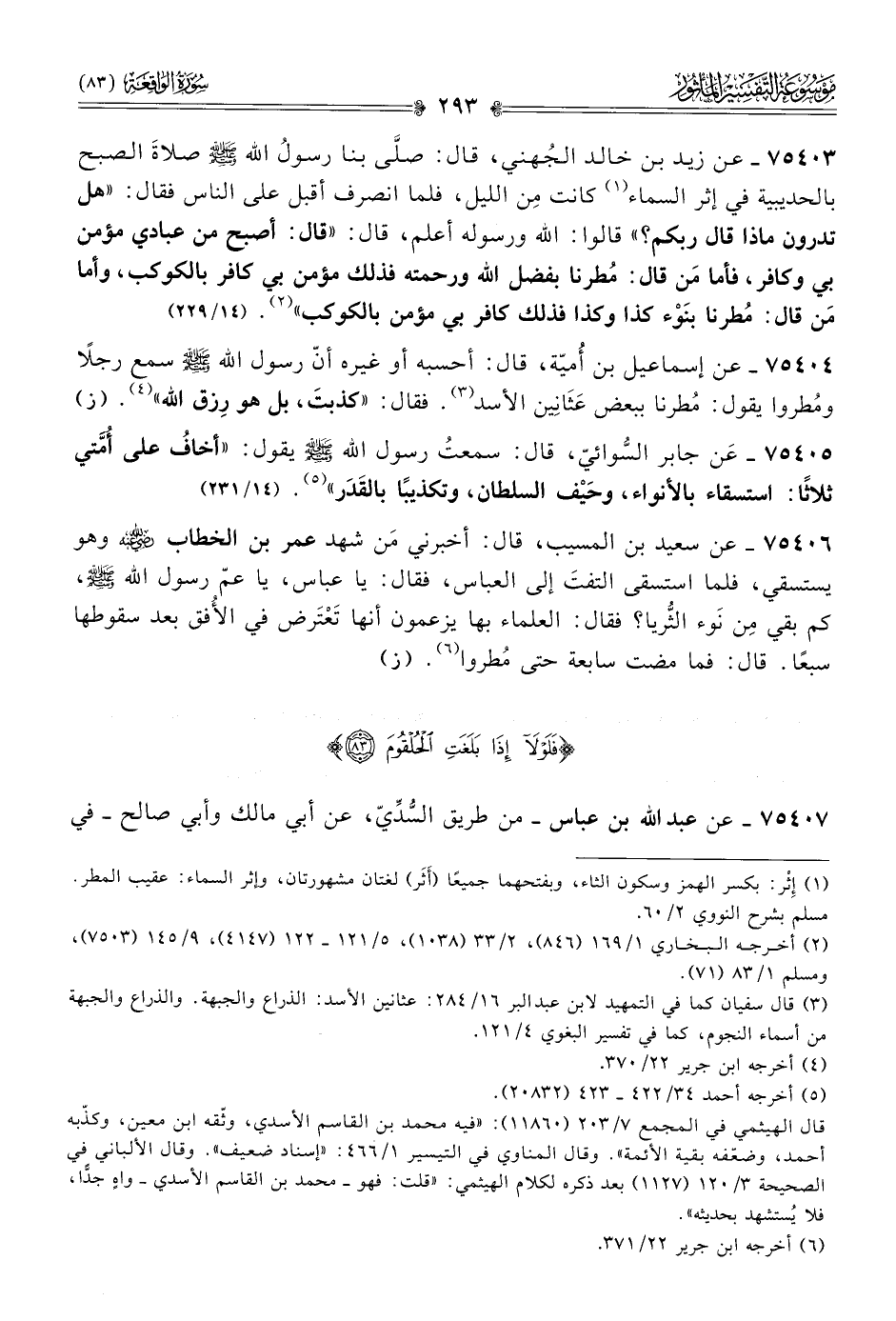 ٧٥٤٠٣ - عن زيد بن خالد الجُهني، قال: صلّى بنا رسولُ الله - صلى الله عليه وسلم - صلاةَ الصبح بالحديبية في إثر السماء (¬١) كانت مِن الليل، فلما انصرف أقبل على الناس فقال: «هل تدرون ماذا قال ربكم؟» قالوا: الله ورسوله أعلم، قال: «قال: أصبح من عبادي مؤمن بي وكافر، فأما مَن قال: مُطرنا بفضل الله ورحمته فذلك مؤمن بي كافر بالكوكب، وأما مَن قال: مُطرنا بنَوْء كذا وكذا فذلك كافر بي مؤمن بالكوكب» (¬٢). (١٤/ ٢٢٩)
