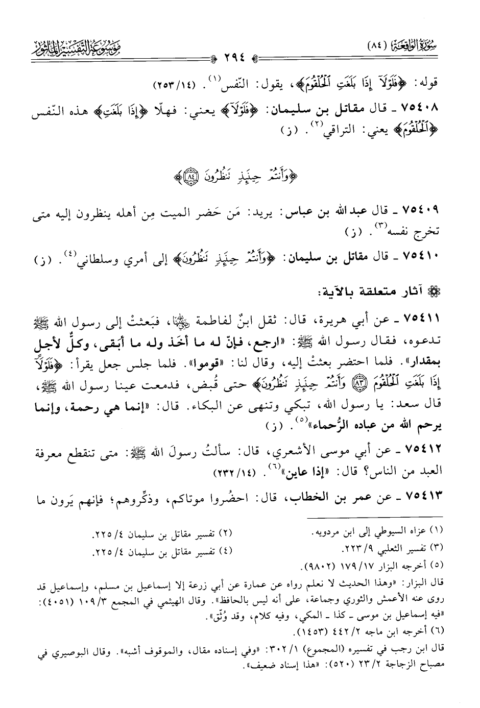 ٧٥٤٠٩ - قال عبد الله بن عباس: يريد: مَن حَضر الميت مِن أهله ينظرون إليه متى تخرج نفسه (¬٣). (ز)