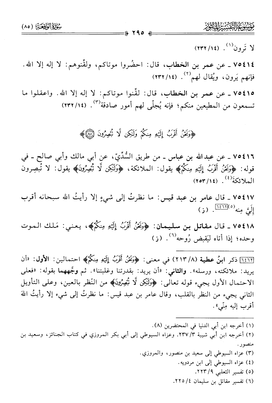 ٧٥٤١٨ - قال مقاتل بن سليمان: {ونَحْنُ أقْرَبُ إلَيْهِ مِنكُمْ}، يعني: مَلك الموت وحده؛ إذا أتاه ليَقبض رُوحه (¬٦). (ز)