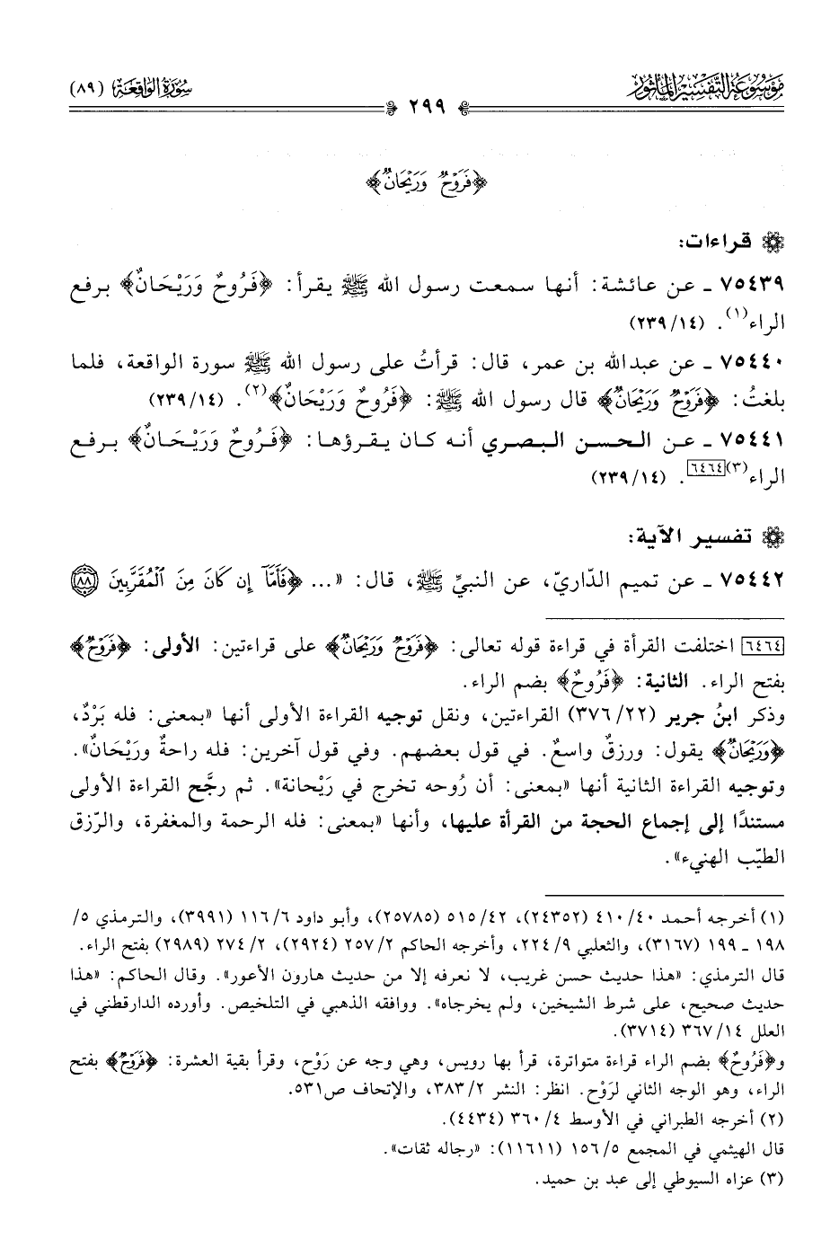 ٧٥٤٤١ - عن الحسن البصري أنه كان يقرؤها: «فَرُوحٌ ورَيْحانٌ» برفع الراء (¬٣) [٦٤٦٤]. (١٤/ ٢٣٩)