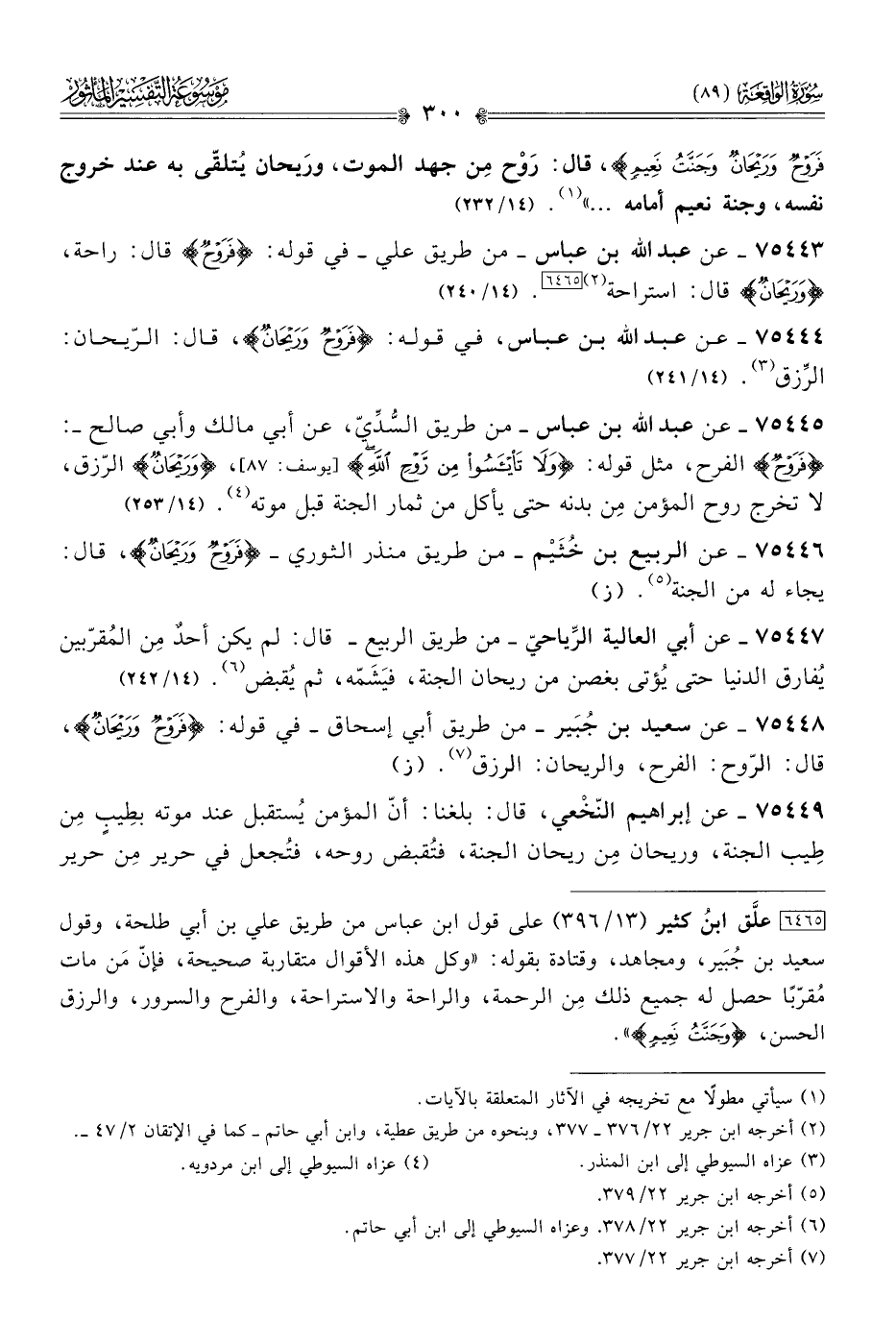 ٧٥٤٤٥ - عن عبد الله بن عباس -من طريق السُّدِّيّ، عن أبي مالك وأبي صالح-: {فَرَوْحٌ} الفرح، مثل قوله: {ولا تَيْأَسُوا مِن رَوْحِ اللَّهِ} [يوسف: ٨٧]، {ورَيْحانٌ} الرّزق، لا تخرج روح المؤمن مِن بدنه حتى يأكل من ثمار الجنة قبل موته (¬٤). (١٤/ ٢٥٣)