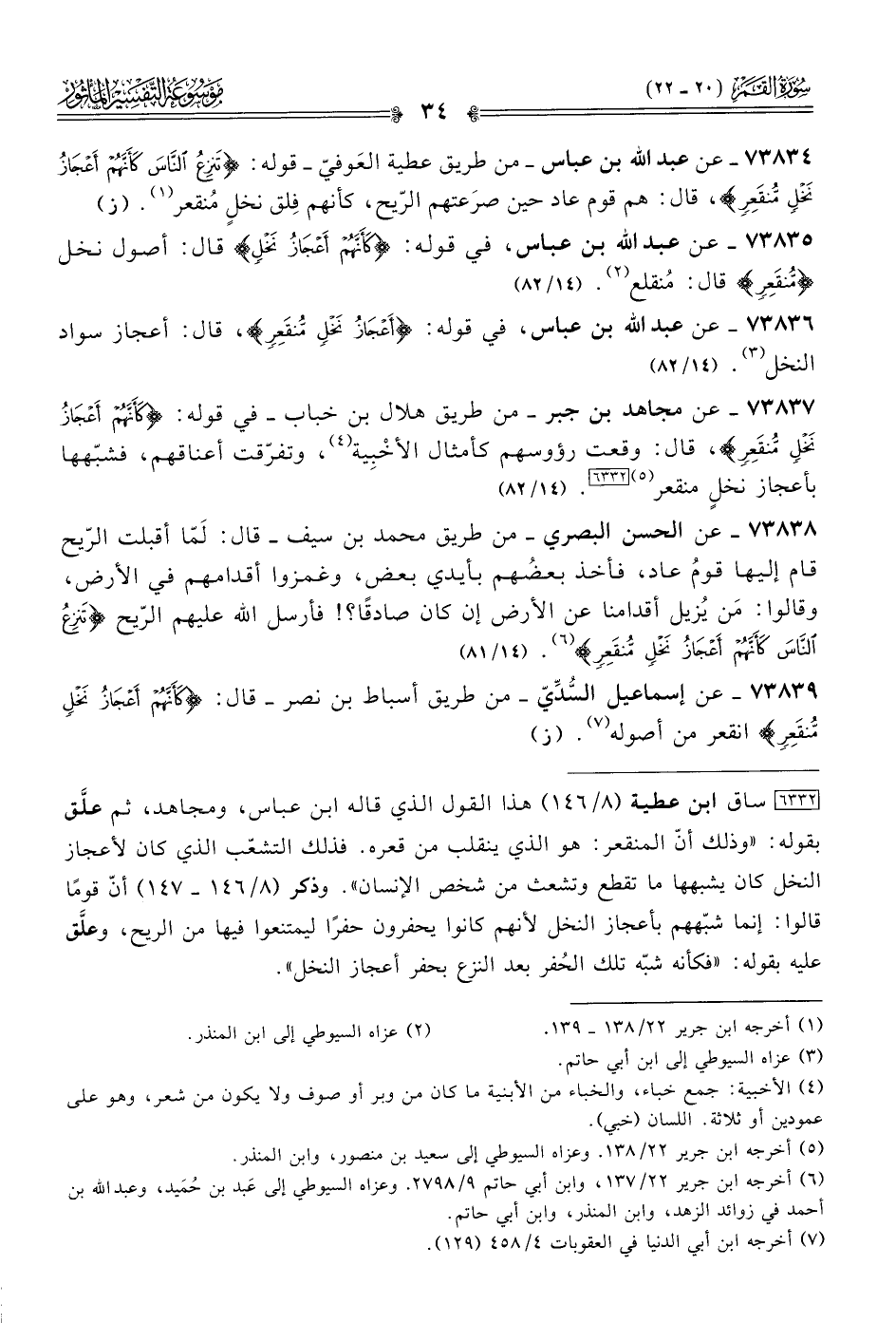 [٦٣٣٢] ساق ابن عطية (٨/ ١٤٦) هذا القول الذي قاله ابن عباس، ومجاهد، ثم علَّق بقوله: «وذلك أنّ المنقعر: هو الذي ينقلب من قعره. فذلك التشعّب الذي كان لأعجاز النخل كان يشبهها ما تقطع وتشعث من شخص الإنسان». وذكر (٨/ ١٤٦ - ١٤٧) أنّ قومًا قالوا: إنما شبّههم بأعجاز النخل لأنهم كانوا يحفرون حفرًا ليمتنعوا فيها من الريح، وعلَّق عليه بقوله: «فكأنه شبّه تلك الحُفر بعد النزع بحفر أعجاز النخل».