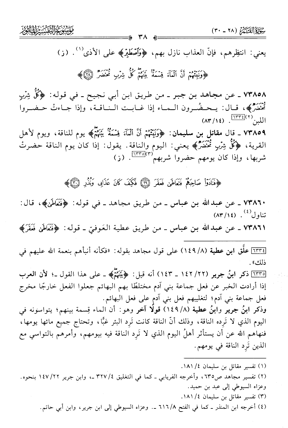 ٧٣٨٥٨ - عن مجاهد بن جبر -من طريق ابن أبي نجيح- في قوله: {كُلُّ شِرْبٍ مُحْتَضَرٌ}، قال: يحضُرون الماء إذا غابت الناقة، وإذا جاءتْ حضروا اللبن (¬٢) [٦٣٣٤]. (١٤/ ٨٣)
