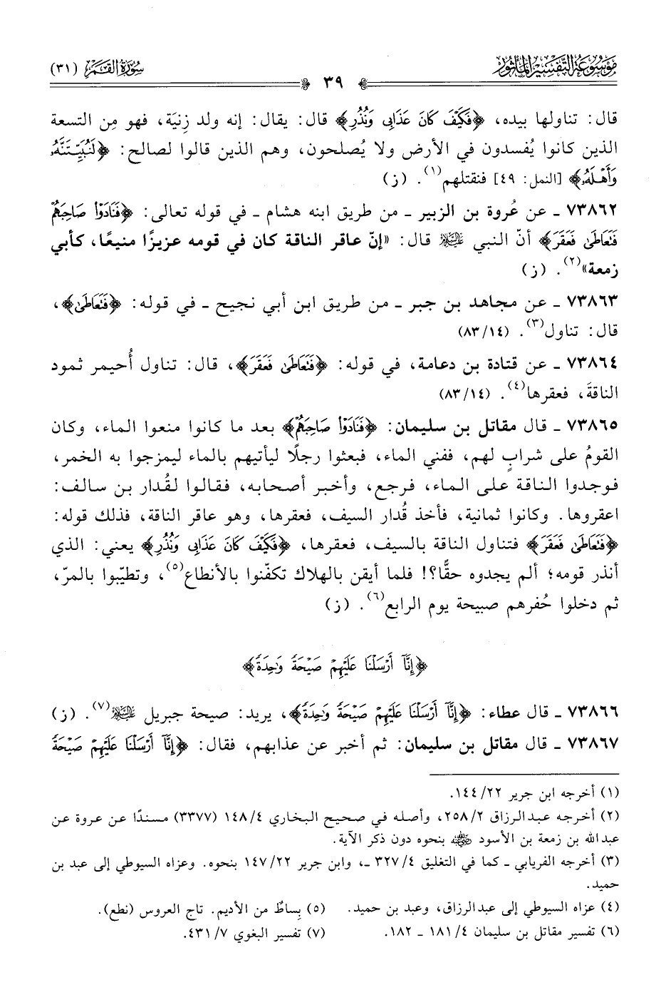 ٧٣٨٦٤ - عن قتادة بن دعامة، في قوله: {فَتَعاطى فَعَقَرَ}، قال: تناول أُحيمر ثمود الناقةَ، فعقرها (¬٤). (١٤/ ٨٣)