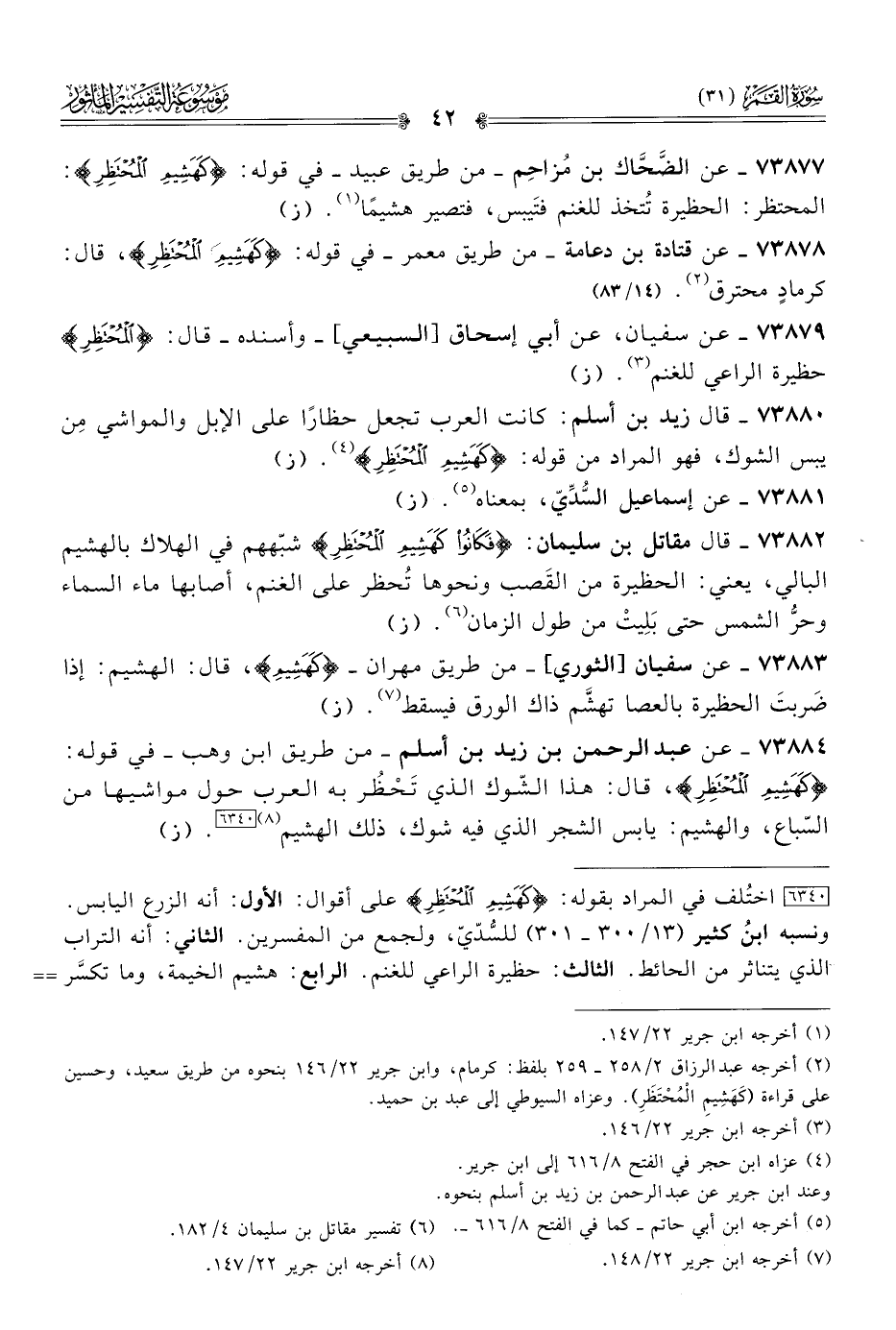 ٧٣٨٧٩ - عن سفيان، عن أبي إسحاق [السبيعي]-وأسنده- قال: {المُحْتَظِرِ} حظيرة الراعي للغنم (¬٣). (ز)