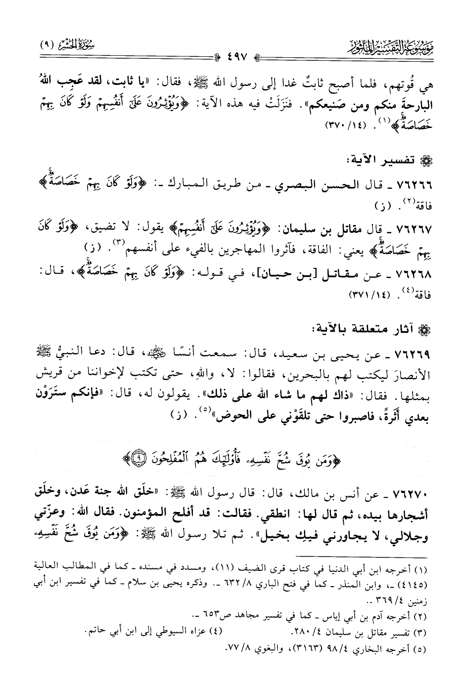 ٧٦٢٦٧ - قال مقاتل بن سليمان: {ويُؤْثِرُونَ عَلى أنْفُسِهِمْ} يقول: لا تضيق، {ولَوْ كانَ بِهِمْ خَصاصَةٌ} يعني: الفاقة، فآثروا المهاجرين بالفيء على أنفسهم (¬٣). (ز)