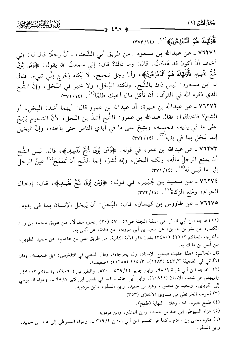 ٧٦٢٧٤ - عن سعيد بن جُبَير، في قوله: {ومَن يُوقَ شُحَّ نَفْسِهِ}، قال: إدخال الحرام، ومَنع الزكاة (¬٦). (١٤/ ٣٧٢)