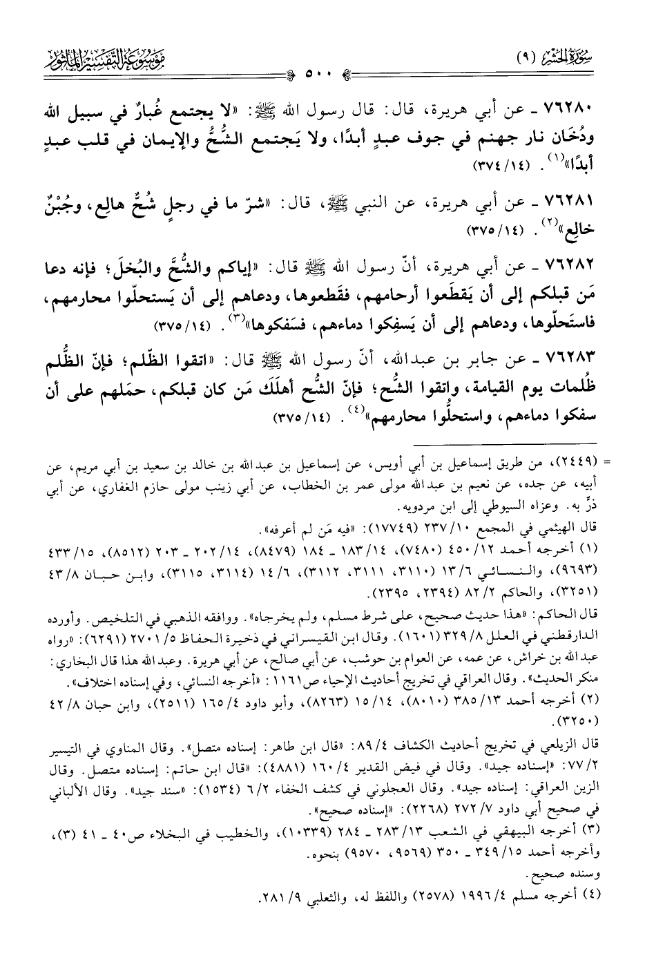٧٦٢٨٣ - عن جابر بن عبد الله، أنّ رسول الله - صلى الله عليه وسلم - قال: «اتقوا الظّلم؛ فإنّ الظُّلم ظُلمات يوم القيامة، واتقوا الشُّح؛ فإنّ الشُّح أهلَكَ مَن كان قبلكم، حمَلهم على أن سفكوا دماءهم، واستحلُّوا محارمهم» (¬٤). (١٤/ ٣٧٥)