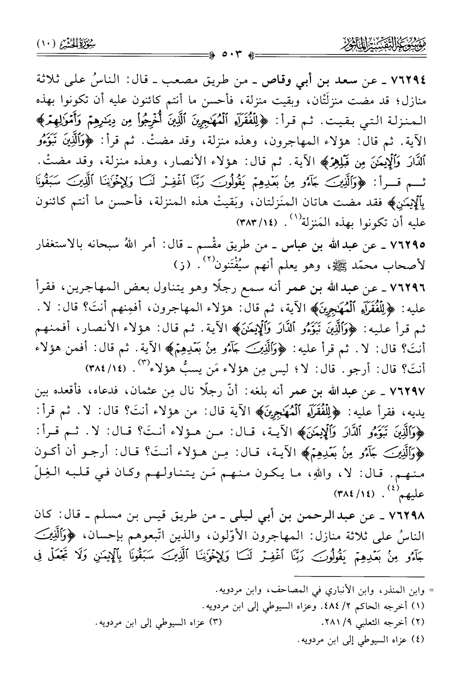 ٧٦٢٩٨ - عن عبد الرحمن بن أبي ليلى -من طريق قيس بن مسلم- قال: كان الناسُ على ثلاثة منازل: المهاجرون الأوّلون، والذين اتّبعوهم بإحسان، {والَّذِينَ جاءُوا مِن بَعْدِهِمْ يَقُولُونَ رَبَّنا اغْفِرْ لَنا ولِإخْوانِنا الَّذِينَ سَبَقُونا بِالإيمانِ ولا تَجْعَلْ فِي