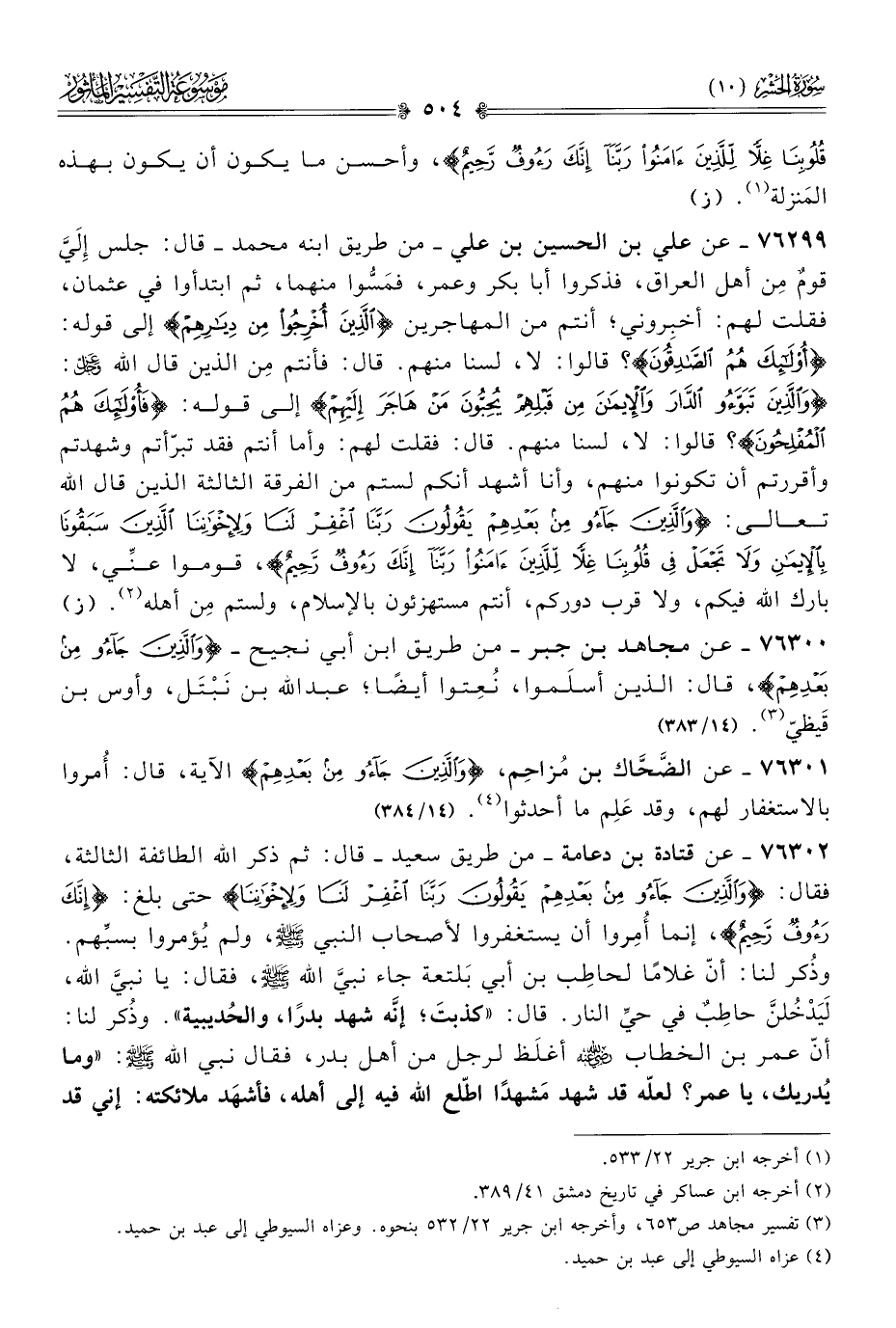 ٧٦٣٠٢ - عن قتادة بن دعامة -من طريق سعيد- قال: ثم ذكر الله الطائفة الثالثة، فقال: {والَّذِينَ جاءُوا مِن بَعْدِهِمْ يَقُولُونَ رَبَّنا اغْفِرْ لَنا ولِإخْوانِنا} حتى بلغ: {إنَّكَ رَءُوفٌ رَحِيمٌ}، إنما أُمِروا أن يستغفروا لأصحاب النبي - صلى الله عليه وسلم -، ولم يُؤمروا بسبِّهم. وذُكر لنا: أنّ غلامًا لحاطِب بن أبي بَلتعة جاء نبيَّ الله - صلى الله عليه وسلم -، فقال: يا نبيَّ الله، لَيَدْخُلنَّ حاطِبٌ في حيِّ النار. قال: «كذبتَ؛ إنّه شهد بدرًا، والحُديبية». وذُكر لنا: أنّ عمر بن الخطاب? أغلَظ لرجل من أهل بدر، فقال نبي الله - صلى الله عليه وسلم -: «وما يُدريك، يا عمر؟ لعلّه قد شهد مَشهدًا اطّلع الله فيه إلى أهله، فأشهَد ملائكته: إني قد