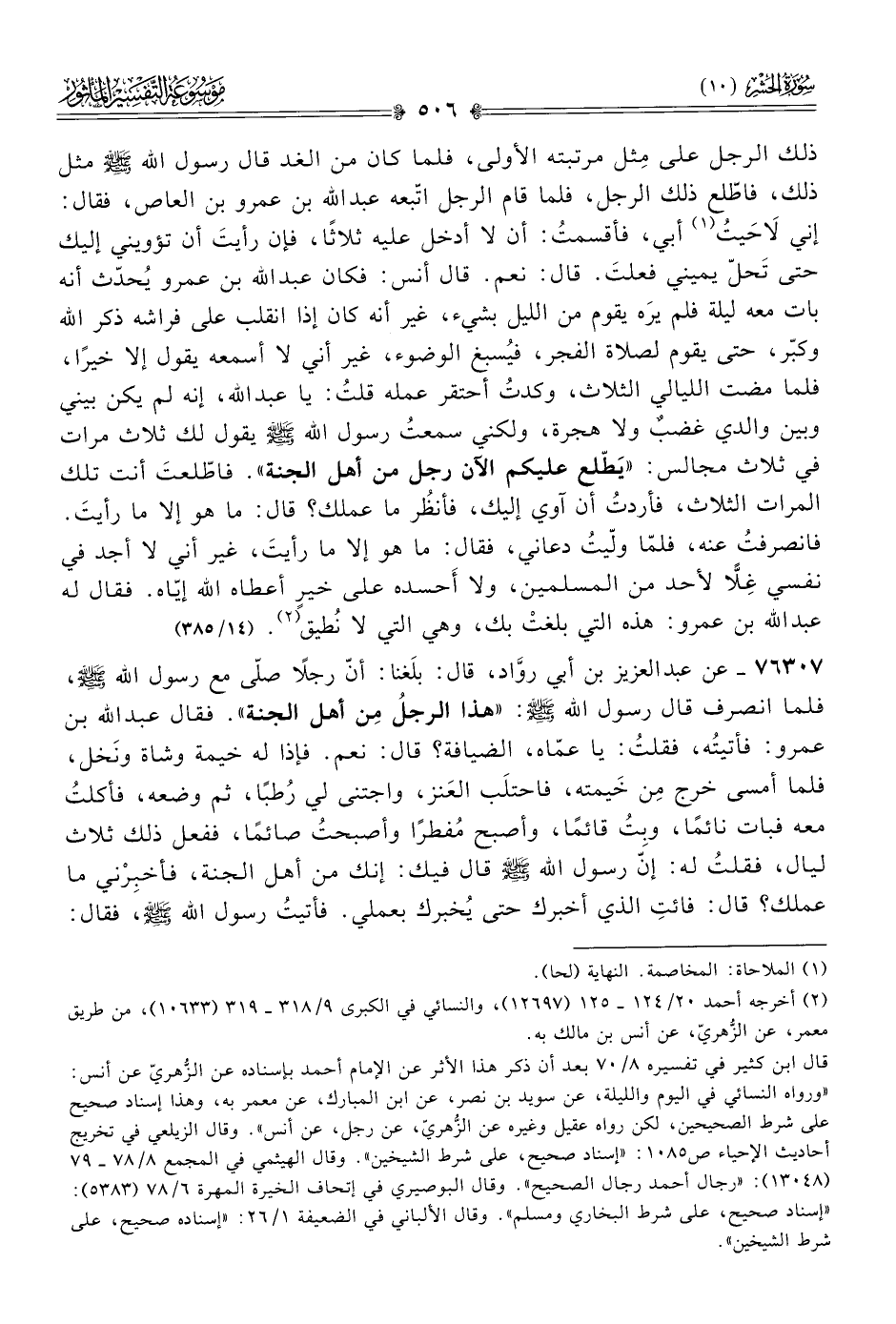 ٧٦٣٠٧ - عن عبد العزيز بن أبي روّاد، قال: بلَغنا: أنّ رجلًا صلّى مع رسول الله - صلى الله عليه وسلم -، فلما انصرف قال رسول الله - صلى الله عليه وسلم -: «هذا الرجلُ مِن أهل الجنة». فقال عبد الله بن عمرو: فأتيتُه، فقلتُ: يا عمّاه، الضيافة؟ قال: نعم. فإذا له خيمة وشاة ونَخل، فلما أمسى خرج مِن خَيمته، فاحتلَب العَنز، واجتنى لي رُطبًا، ثم وضعه، فأكلتُ معه فبات نائمًا، وبِتُ قائمًا، وأصبح مُفطرًا وأصبحتُ صائمًا، ففعل ذلك ثلاث ليال، فقلتُ له: إنّ رسول الله - صلى الله عليه وسلم - قال فيك: إنك من أهل الجنة، فأخبِرْني ما عملك؟ قال: فائتِ الذي أخبرك حتى يُخبرك بعملي. فأتيتُ رسول الله - صلى الله عليه وسلم -، فقال: