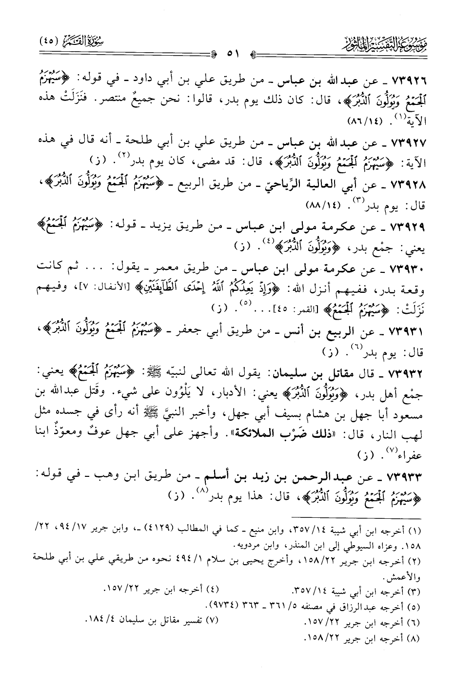 ٧٣٩٢٨ - عن أبي العالية الرِّياحيّ -من طريق الربيع- {سَيُهْزَمُ الجَمْعُ ويُوَلُّونَ الدُّبُرَ}، قال: يوم بدر (¬٣). (١٤/ ٨٨)