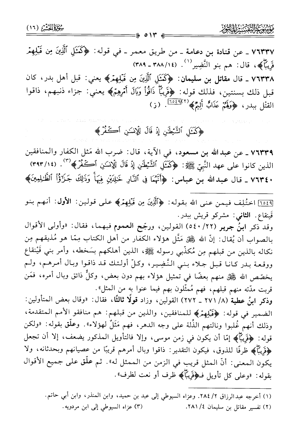 ٧٦٣٣٩ - عن عبد الله بن مسعود، في الآية، قال: ضرب الله مَثل الكفار والمنافقين الذين كانوا على عهد النَّبِيّ - صلى الله عليه وسلم -: {كَمَثَلِ الشَّيْطانِ إذْ قالَ لِلْإنْسانِ اكْفُرْ} (¬٣). (١٤/ ٣٩٣)