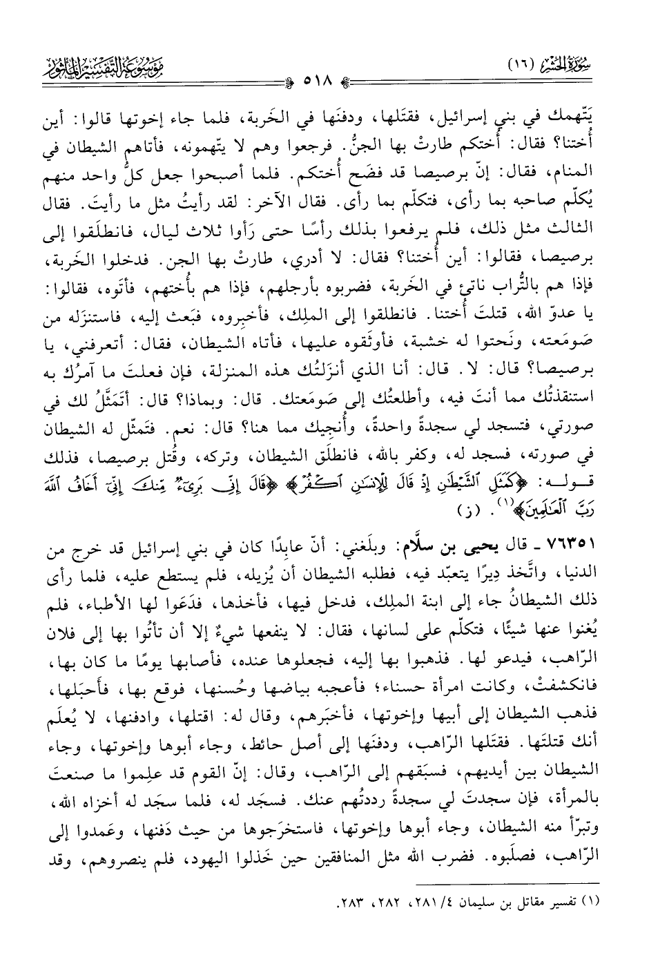 ٧٦٣٥١ - قال يحيى بن سلّام: وبلَغني: أنّ عابِدًا كان في بني إسرائيل قد خرج من الدنيا، واتَّخذ دِيرًا يتعبّد فيه، فطلبه الشيطان أن يُزيله، فلم يستطع عليه، فلما رأى ذلك الشيطانُ جاء إلى ابنة الملِك، فدخل فيها، فأخذها، فدَعَوا لها الأطباء، فلم يُغنوا عنها شيئًا، فتكلّم على لسانها، فقال: لا ينفعها شيءٌ إلا أن تأتُوا بها إلى فلان الرّاهب، فيدعو لها. فذهبوا بها إليه، فجعلوها عنده، فأصابها يومًا ما كان بها، فانكشفتْ، وكانت امرأة حسناء؛ فأعجبه بياضها وحُسنها، فوقع بها، فأَحبَلها، فذهب الشيطان إلى أبيها وإخوتها، فأخبَرهم، وقال له: اقتلها، وادفنها، لا يُعلَم أنك قتلتَها. فقتَلها الرّاهب، ودفنَها إلى أصل حائط، وجاء أبوها وإخوتها، وجاء الشيطان بين أيديهم، فسبَقهم إلى الرّاهب، وقال: إنّ القوم قد علِموا ما صنعتَ بالمرأة، فإن سجدتَ لي سجدةً رددتُهم عنك. فسجَد له، فلما سجَد له أخزاه الله، وتبرّأ منه الشيطان، وجاء أبوها وإخوتها، فاستخرَجوها من حيث دَفنها، وعَمدوا إلى الرّاهب، فصلَبوه. فضرب الله مثل المنافقين حين خَذلوا اليهود، فلم ينصروهم، وقد