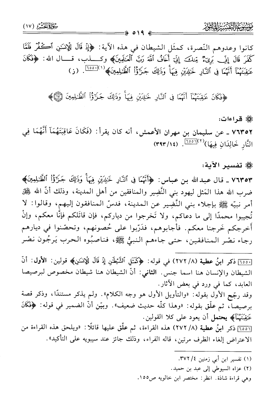 ٧٦٣٥٣ - قال عبد الله بن عباس: {أنَّهُما فِي النّارِ خالِدَيْنِ فِيها وذَلِكَ جَزاءُ الظّالِمِينَ} ضرب الله هذا المَثل ليهود بني النَّضِير والمنافقين من أهل المدينة، وذلك أنّ الله - عز وجل - أمر نبيّه - صلى الله عليه وسلم - بإجلاء بني النَّضِير عن المدينة، فدسّ المنافقون إليهم، وقالوا: لا تُجيبوا محمدًا إلى ما دعاكم، ولا تَخرجوا من دياركم، فإن قاتَلكم فإنّا معكم، وإنْ أخرجكم خَرجنا معكم. فأجابوهم، فدَرّبوا على حُصونهم، وتحصّنوا في ديارهم رجاء نصْر المنافقين، حتى جاءهم النبيُّ - صلى الله عليه وسلم -، فناصبُوه الحرب يَرجُون نصْر