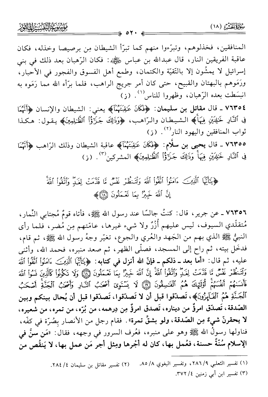 ٧٦٣٥٦ - عن جرير، قال: كنتُ جالسًا عند رسول الله - صلى الله عليه وسلم -، فأتاه قومٌ مُجتابي النِّمار، مُتقلّدي السيوف، ليس عليهم أُزُرٌ ولا شيء غيرها، عامّتهم مِن مُضر، فلما رأى النبيُّ - صلى الله عليه وسلم - الذي بهم من الجَهد والعُري والجوع، تغيّر وجهُ رسول الله - صلى الله عليه وسلم -، ثم قام، فدخَل بيته، ثم راح إلى المسجد، فصلّى الظهر، ثم صعد منبره، فحمد الله، وأثنى عليه، ثم قال: «أما بعد -ذلكم- فإنّ الله أنزل في كتابه: {يا أيُّها الَّذِينَ آمَنُوا اتَّقُوا اللَّهَ ولْتَنْظُرْ نَفْسٌ ما قَدَّمَتْ لِغَدٍ واتَّقُوا اللَّهَ إنَّ اللَّهَ خَبِيرٌ بِما تَعْمَلُونَ ولا تَكُونُوا كالَّذِينَ نَسُوا اللَّهَ فَأَنْساهُمْ أنْفُسَهُمْ أُولَئِكَ هُمُ الفاسِقُونَ لا يَسْتَوِي أصْحابُ النّارِ وأَصْحابُ الجَنَّةِ أصْحابُ الجَنَّةِ هُمُ الفائِزُونَ}، تَصدّقوا قبل أن لا تَصدّقوا، تَصدّقوا قبل أن يُحال بينكم وبين الصّدقة، تَصدّق امرؤٌ من ديناره، تَصدق امرؤٌ مِن دِرهمه، من بُرّه، من تمره، من شعيره، لا يحقرنّ شيءٌ مِن الصّدقة، ولو بشقِّ تمرة». فقام رجل من الأنصار بِصُرّة في كفّه، فناولها رسولُ الله - صلى الله عليه وسلم - وهو على منبره، فعُرف السرور في وجهه، فقال: «مَن سنَّ في الإسلام سُنّةً حسنة، فعُمل بها، كان له أجْرها ومِثل أجر مَن عمل بها، لا يَنقُص من