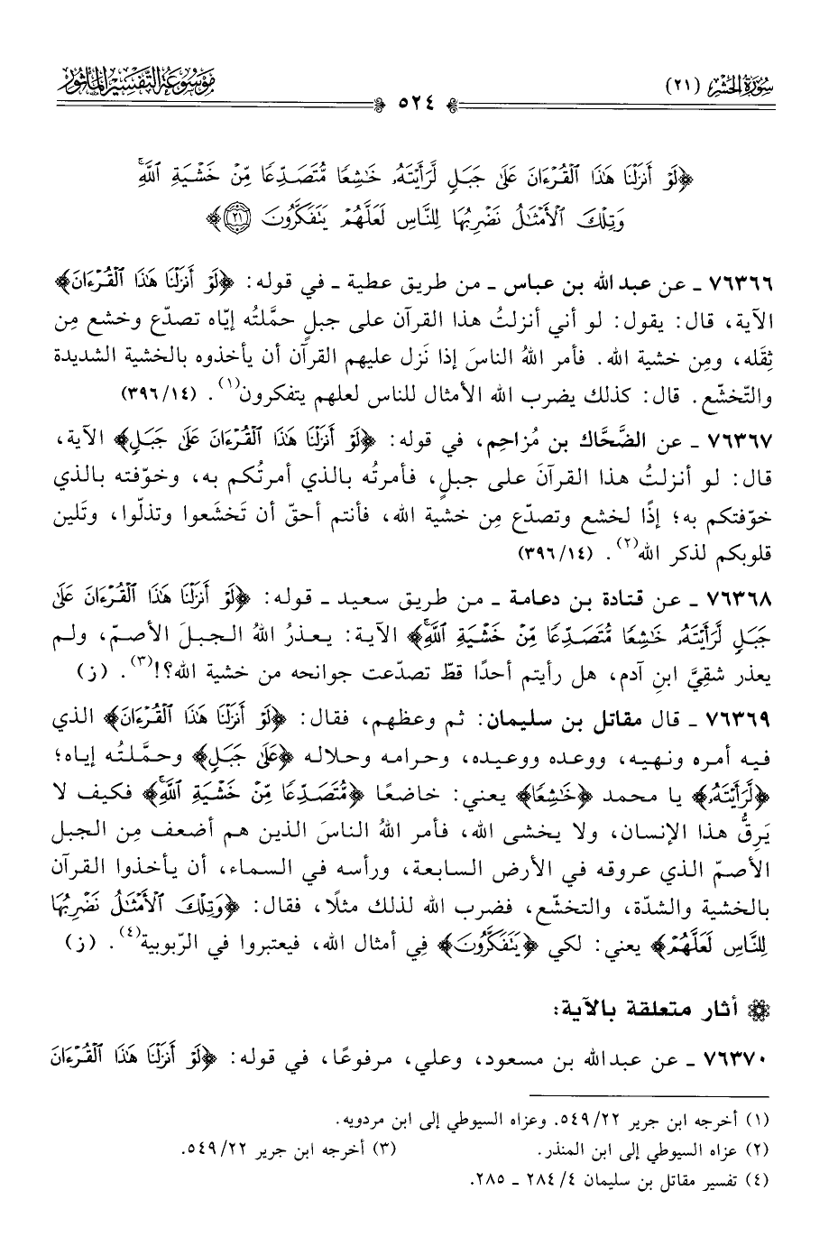 ٧٦٣٦٦ - عن عبد الله بن عباس -من طريق عطية- في قوله: {لَوْ أنْزَلْنا هَذا القُرْآنَ} الآية، قال: يقول: لو أني أنزلتُ هذا القرآن على جبلٍ حمَّلتُه إيّاه تصدّع وخشع مِن ثِقَله، ومِن خشية الله. فأمر اللهُ الناسَ إذا نَزل عليهم القرآن أن يأخذوه بالخشية الشديدة والتّخشّع. قال: كذلك يضرب الله الأمثال للناس لعلهم يتفكرون (¬١). (١٤/ ٣٩٦)