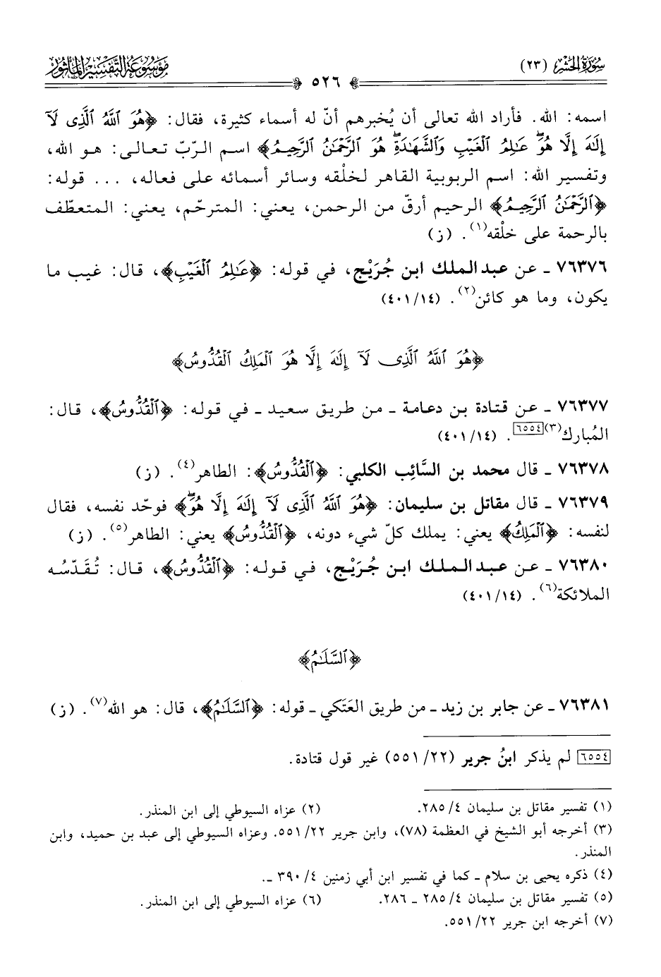 ٧٦٣٨١ - عن جابر بن زيد -من طريق العَتَكي- قوله: {السَّلامُ}، قال: هو الله (¬٧). (ز)