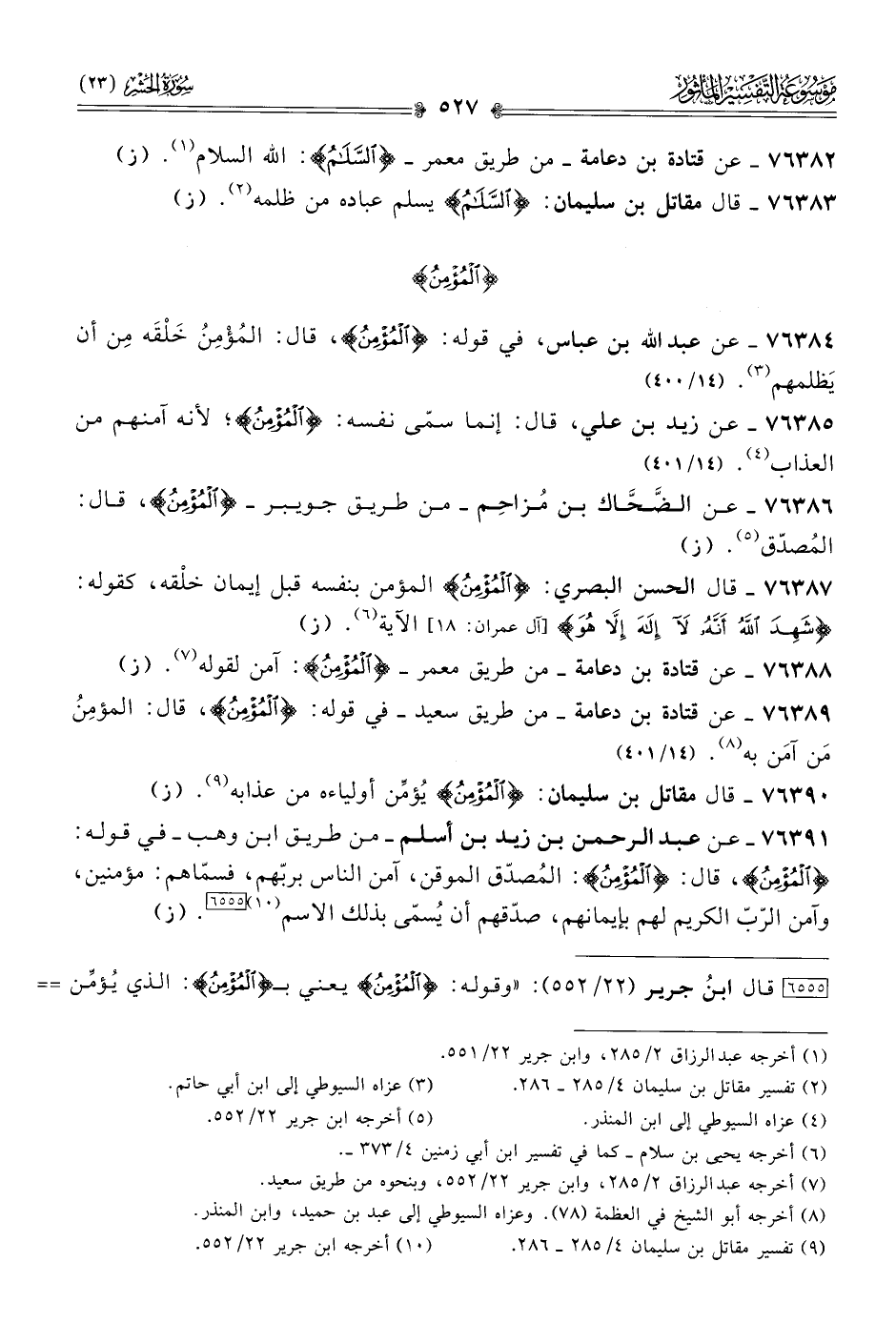 ٧٦٣٨٨ - عن قتادة بن دعامة -من طريق معمر- {المُؤْمِنُ}: آمن لقوله (¬٧). (ز)