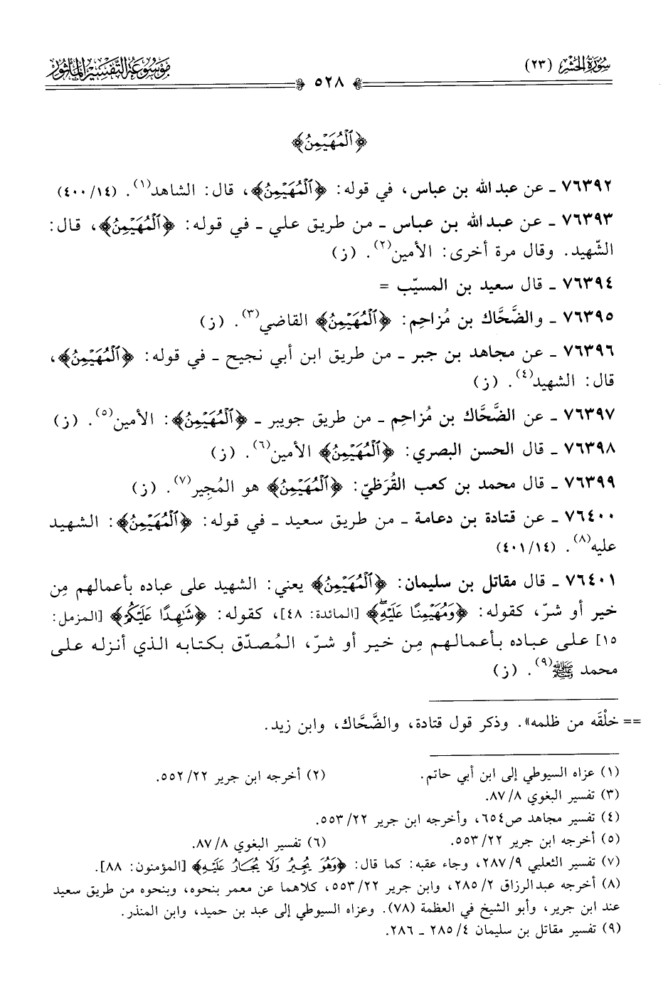 ٧٦٣٩٢ - عن عبد الله بن عباس، في قوله: {المُهَيْمِنُ}، قال: الشاهد (¬١). (١٤/ ٤٠٠)