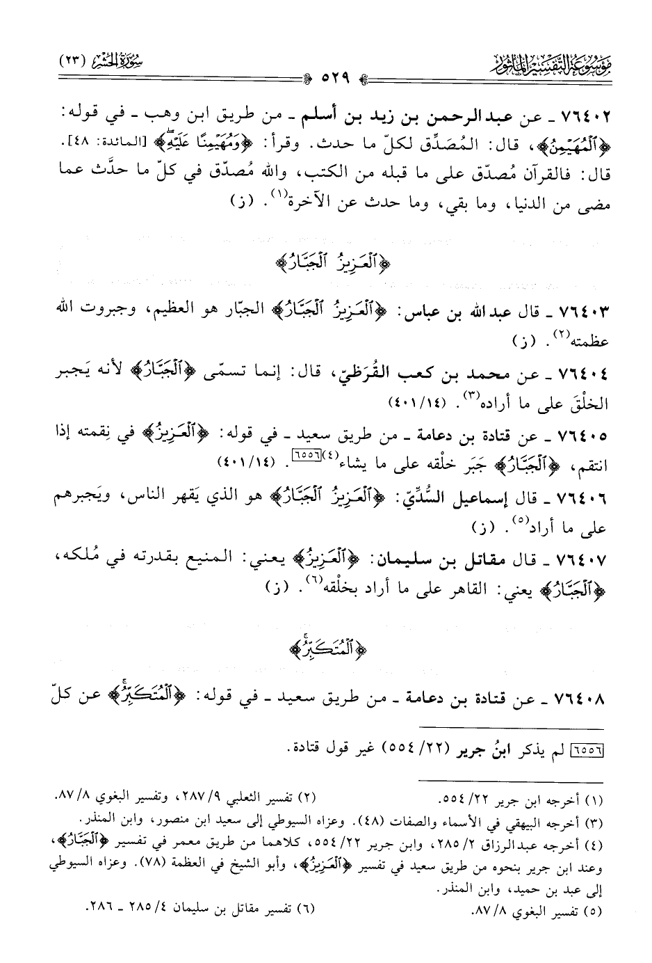 ٧٦٤٠٥ - عن قتادة بن دعامة -من طريق سعيد- في قوله: {العَزِيزُ} في نِقمته إذا انتقم، {الجَبّارُ} جَبَر خلْقه على ما يشاء (¬٤) [٦٥٥٦]. (١٤/ ٤٠١)
