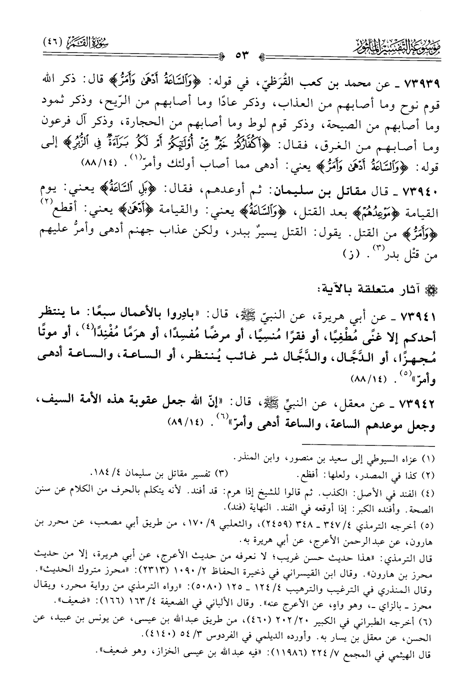 ٧٣٩٣٩ - عن محمد بن كعب القُرَظيّ، في قوله: {والسّاعَةُ أدْهى وأَمَرُّ} قال: ذكر الله قوم نوح وما أصابهم من العذاب، وذكر عادًا وما أصابهم من الرّيح، وذكر ثمود وما أصابهم من الصيحة، وذكر قوم لوط وما أصابهم من الحجارة، وذكر آل فرعون وما أصابهم من الغرق، فقال: {أكُفّارُكُمْ خَيْرٌ مِن أُولَئِكُمْ أمْ لَكُمْ بَراءَةٌ فِي الزُّبُرِ} إلى قوله: {والسّاعَةُ أدْهى وأَمَرُّ} يعني: أدهى مما أصاب أولئك وأمرّ (¬١). (١٤/ ٨٨)