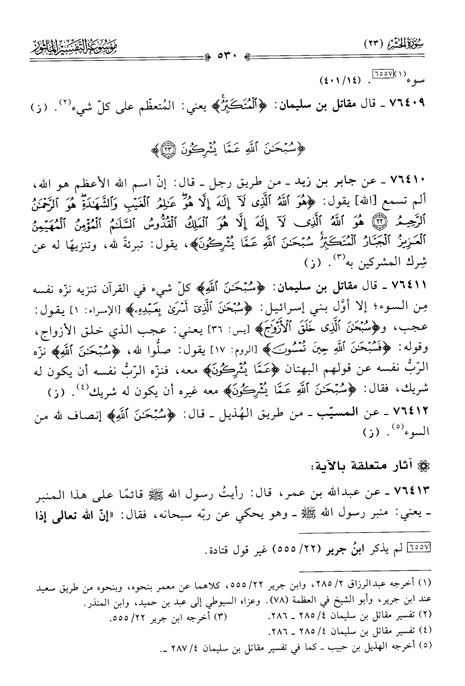 ٧٦٤١٠ - عن جابر بن زيد -من طريق رجل- قال: إنّ اسم الله الأعظم هو الله، ألم تسمع [الله] يقول: {هُوَ اللَّهُ الَّذِي لا إلَهَ إلّا هُوَ عالِمُ الغَيْبِ والشَّهادَةِ هُوَ الرَّحْمَنُ الرَّحِيمُ هُوَ اللَّهُ الَّذِي لا إلَهَ إلّا هُوَ المَلِكُ القُدُّوسُ السَّلامُ المُؤْمِنُ المُهَيْمِنُ العَزِيزُ الجَبّارُ المُتَكَبِّرُ سُبْحانَ اللَّهِ عَمّا يُشْرِكُونَ}، يقول: تبرئةً لله، وتنزيهًا له عن شِرك المشركين به (¬٣). (ز)
