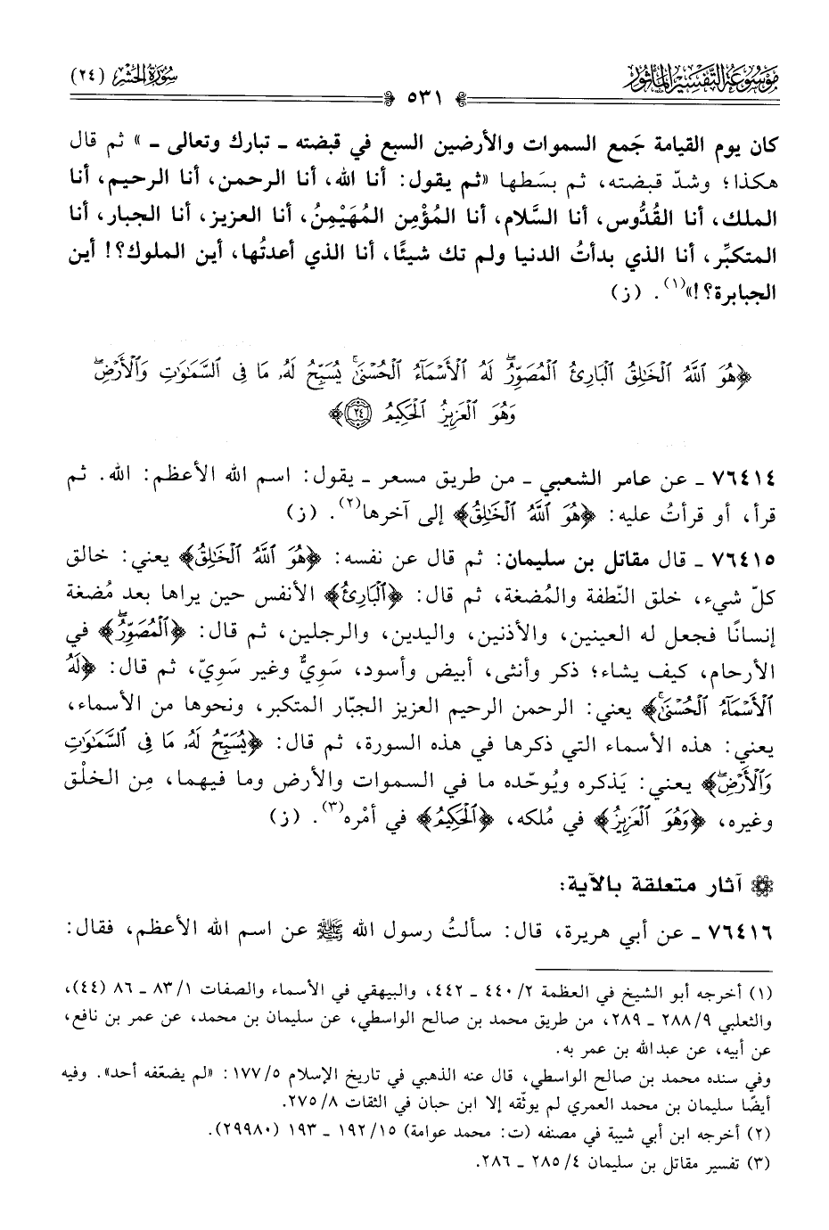 ٧٦٤١٤ - عن عامر الشعبي -من طريق مسعر- يقول: اسم الله الأعظم: الله. ثم قرأ، أو قرأتُ عليه: {هُوَ اللَّهُ الخالِقُ} إلى آخرها (¬٢). (ز)