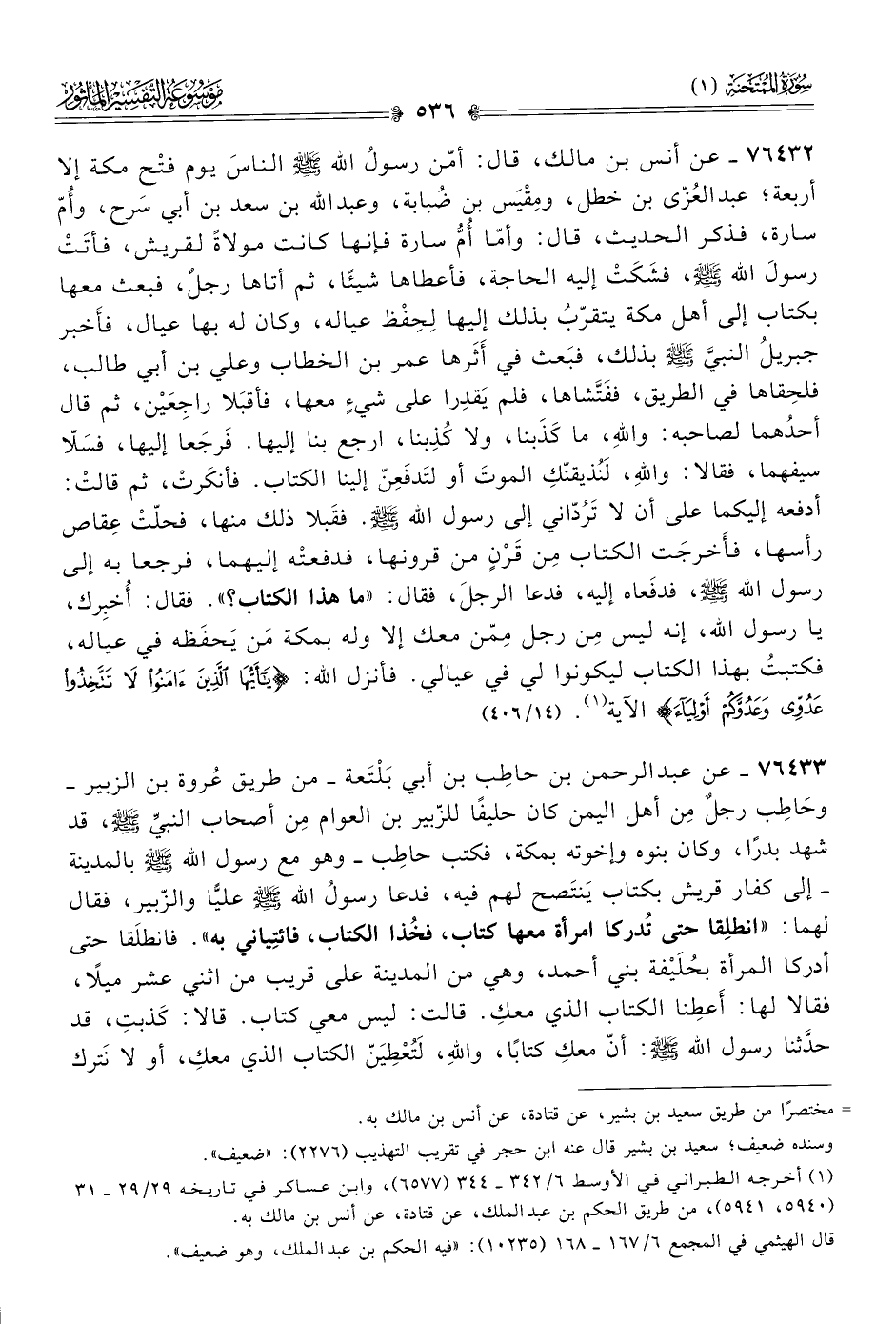 ٧٦٤٣٢ - عن أنس بن مالك، قال: أمّن رسولُ الله - صلى الله عليه وسلم - الناسَ يوم فتْح مكة إلا أربعة؛ عبد العُزّى بن خطل، ومِقْيَس بن ضُبابة، وعبد الله بن سعد بن أبي سَرح، وأُمّ سارة، فذكر الحديث، قال: وأمّا أُمُّ سارة فإنها كانت مولاةً لقريش، فأتَتْ رسولَ الله - صلى الله عليه وسلم -، فشَكَتْ إليه الحاجة، فأعطاها شيئًا، ثم أتاها رجلٌ، فبعث معها بكتاب إلى أهل مكة يتقرّبُ بذلك إليها لِحِفْظ عياله، وكان له بها عيال، فأَخبر جبريلُ النبيَّ - صلى الله عليه وسلم - بذلك، فبَعث في أثَرها عمر بن الخطاب وعلي بن أبي طالب، فلحِقاها في الطريق، ففَتَّشاها، فلم يَقدِرا على شيءٍ معها، فأقبَلا راجِعَيْن، ثم قال أحدُهما لصاحبه: واللهِ، ما كَذَبنا، ولا كُذِبنا، ارجع بنا إليها. فَرجَعا إليها، فسَلّا سيفهما، فقالا: واللهِ، لَنُذيقنّكِ الموتَ أو لتَدفَعِنّ إلينا الكتاب. فأنكَرتْ، ثم قالتْ: أدفعه إليكما على أن لا تَرُدّاني إلى رسول الله - صلى الله عليه وسلم -. فقَبلا ذلك منها، فحلّتْ عِقاص رأسها، فأَخرجَت الكتاب مِن قَرْنٍ من قرونها، فدفعتْه إليهما، فرجعا به إلى رسول الله - صلى الله عليه وسلم -، فدفَعاه إليه، فدعا الرجلَ، فقال: «ما هذا الكتاب؟». فقال: أُخبِرك، يا رسول الله، إنه ليس مِن رجل مِمّن معك إلا وله بمكة مَن يَحفَظه في عياله، فكتبتُ بهذا الكتاب ليكونوا لي في عيالي. فأنزل الله: {يأَيُّها الَّذِينَ آمَنُوا لا تَتَّخِذُوا عَدُوِّي وعَدُوَّكُمْ أوْلِياءَ} الآية (¬١). (١٤/ ٤٠٦)