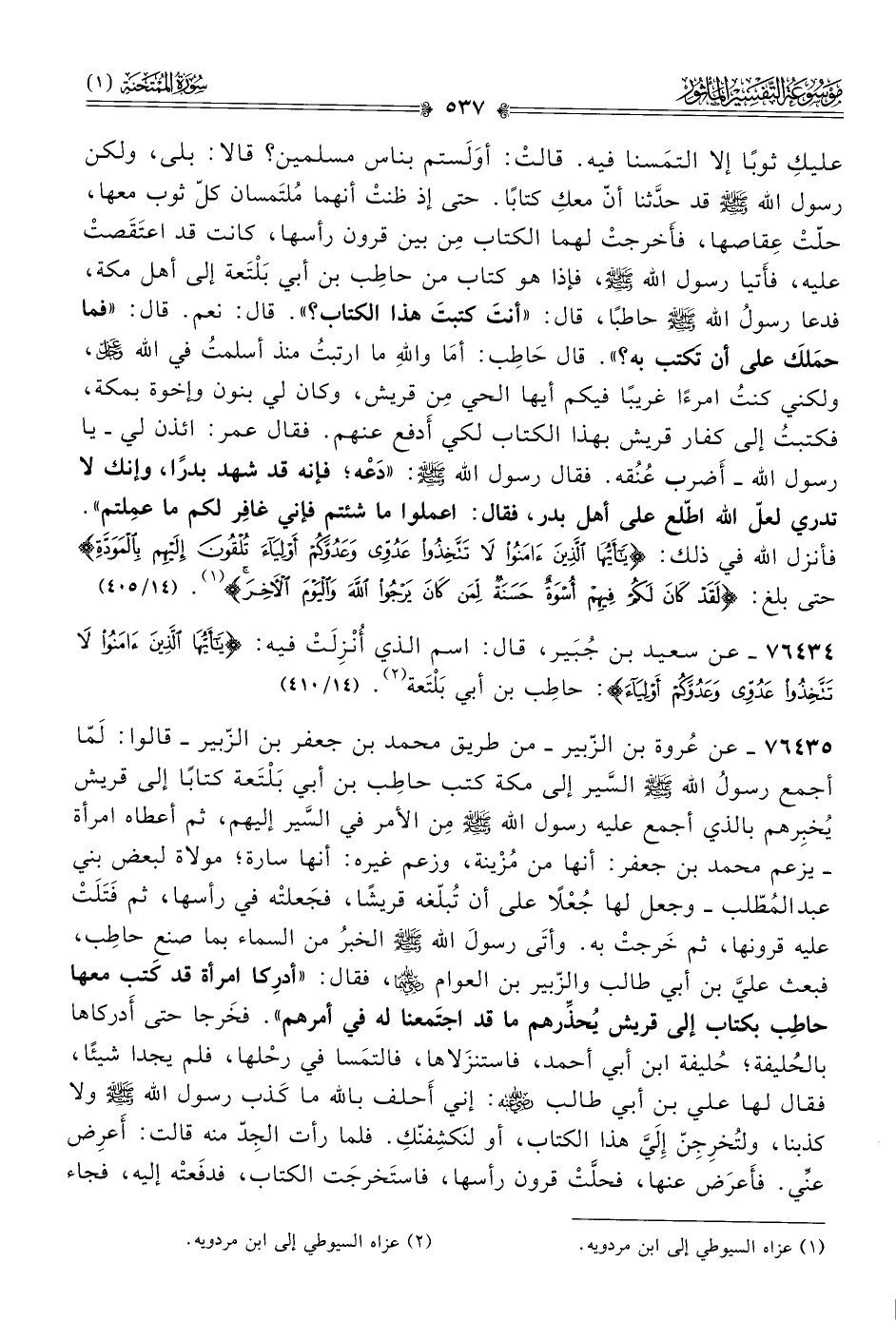 ٧٦٤٣٤ - عن سعيد بن جُبَير، قال: اسم الذي أُنَزِلَتْ فيه: {يأَيُّها الَّذِينَ آمَنُوا لا تَتَّخِذُوا عَدُوِّي وعَدُوَّكُمْ أوْلِياءَ}: حاطِب بن أبي بَلْتَعة (¬٢). (١٤/ ٤١٠)