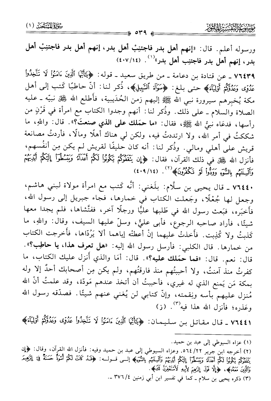 ٧٦٤٣٩ - عن قتادة بن دعامة -من طريق سعيد - قوله: {يا أيُّها الَّذِينَ آمَنُوا لا تَتَّخِذُوا عَدُوِّي وعَدُوَّكُمْ أوْلِياءَ} حتى بلغ: {سَواءَ السَّبِيلِ}، ذُكر لنا: أنّ حاطبًا كَتب إلى أهل مكة يُخبِرهم سيرورة نبي الله - صلى الله عليه وسلم - إليهم زمن الحُدَيبية، فأَطلع الله - عز وجل - نبيّه -عليه الصلاة والسلام- على ذلك. وذُكر لنا: أنهم وجدوا الكتاب مع امرأة في قَرْنٍ من رأسها، فدعاه نبيُّ الله - صلى الله عليه وسلم -، فقال: «ما حمَلك على الذي صنعتَ؟». قال: واللهِ، ما شككتُ في أمر الله، ولا ارتددتُ فيه، ولكن لي هناك أهلًا ومالًا، فأردتُ مصانعة قريش على أهلي ومالي. وذُكر لنا: أنه كان حليفًا لقريش لم يكن مِن أنفُسهم، فأنزل الله - عز وجل - في ذلك القرآن، فقال: {إنْ يَثْقَفُوكُمْ يَكُونُوا لَكُمْ أعْداءً ويَبْسُطُوا إلَيْكُمْ أيْدِيَهُمْ وأَلْسِنَتَهُمْ بِالسُّوءِ ووَدُّوا لَوْ تَكْفُرُونَ} (¬٢). (١٤/ ٤٠٩)