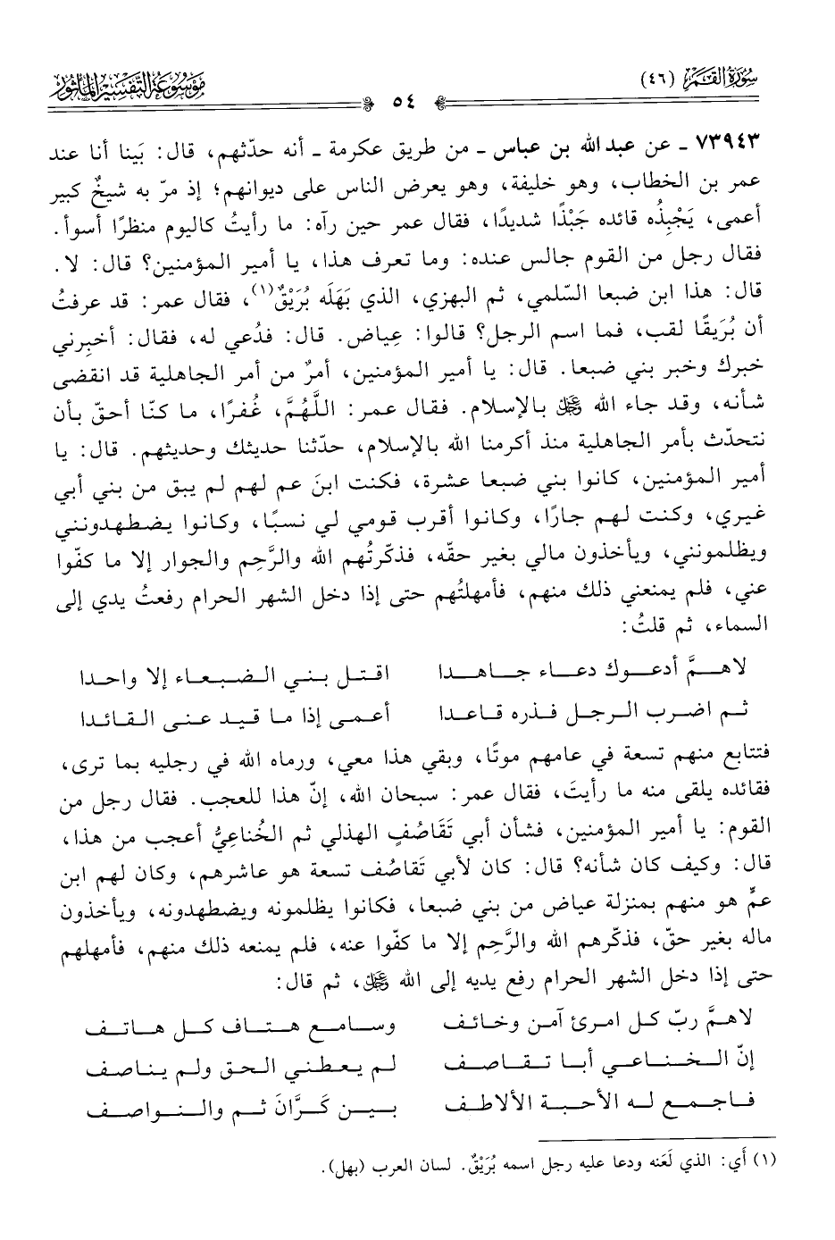 ٧٣٩٤٣ - عن عبد الله بن عباس -من طريق عكرمة- أنه حدّثهم، قال: بَينا أنا عند عمر بن الخطاب، وهو خليفة، وهو يعرض الناس على ديوانهم؛ إذ مرّ به شيخٌ كبير أعمى، يَجْبِذُه قائده جَبْذًا شديدًا، فقال عمر حين رآه: ما رأيتُ كاليوم منظرًا أسوأ. فقال رجل من القوم جالس عنده: وما تعرف هذا، يا أمير المؤمنين؟ قال: لا. قال: هذا ابن ضبعا السّلمي، ثم البهزي، الذي بَهَلَه بُرَيْقٌ (¬١)، فقال عمر: قد عرفتُ أن بُرَيقًا لقب، فما اسم الرجل؟ قالوا: عِياض. قال: فدُعي له، فقال: أخبِرني خبرك وخبر بني ضبعا. قال: يا أمير المؤمنين، أمرٌ من أمر الجاهلية قد انقضى شأنه، وقد جاء الله - عز وجل - بالإسلام. فقال عمر: اللهم، غُفرًا، ما كنّا أحقّ بأن نتحدّث بأمر الجاهلية منذ أكرمنا الله بالإسلام، حدّثنا حديثك وحديثهم. قال: يا أمير المؤمنين، كانوا بني ضبعا عشرة، فكنت ابنَ عم لهم لم يبق من بني أبي غيري، وكنت لهم جارًا، وكانوا أقرب قومي لي نسبًا، وكانوا يضطهدونني ويظلمونني، ويأخذون مالي بغير حقّه، فذكّرتُهم الله والرَّحِم والجوار إلا ما كفّوا عني، فلم يمنعني ذلك منهم، فأمهلتُهم حتى إذا دخل الشهر الحرام رفعتُ يدي إلى السماء، ثم قلتُ: