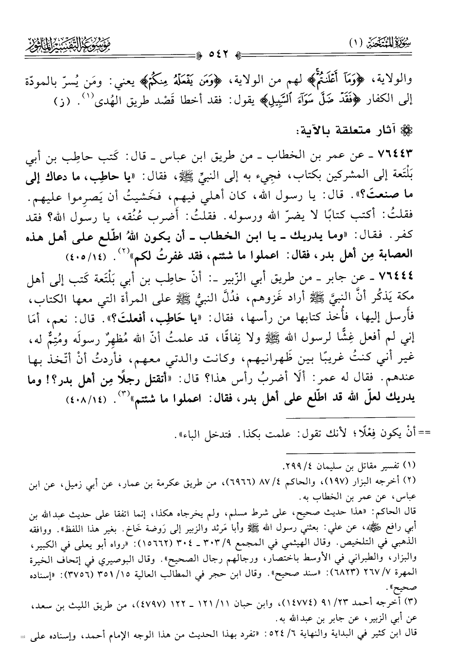 ٧٦٤٤٤ - عن جابر -من طريق أبي الزّبير-: أنّ حاطِب بن أبي بَلْتَعة كَتب إلى أهل مكة يَذكُر أنّ النبيَّ - صلى الله عليه وسلم - أراد غَزوهم، فدُلَّ النبيُّ - صلى الله عليه وسلم - على المرأة التي معها الكتاب، فأَرسل إليها، فأُخذ كتابها من رأسها، فقال: «يا حاطِب، أفعلتَ؟». قال: نعم، أما إني لم أفعل غِشًّا لرسول الله - صلى الله عليه وسلم - ولا نِفاقًا، قد علمتُ أنّ الله مُظهِرٌ رسولَه ومُتِمٌّ له، غير أني كنتُ غريبًا بين ظَهرانيهم، وكانت والدتي معهم، فأردتُ أنْ أتّخذ بها عندهم. فقال له عمر: ألا أضربُ رأس هذا؟ قال: «أتقتل رجلًا مِن أهل بدر؟! وما يدريك لعلّ الله قد اطّلع على أهل بدر، فقال: اعملوا ما شئتم» (¬٣). (١٤/ ٤٠٨)