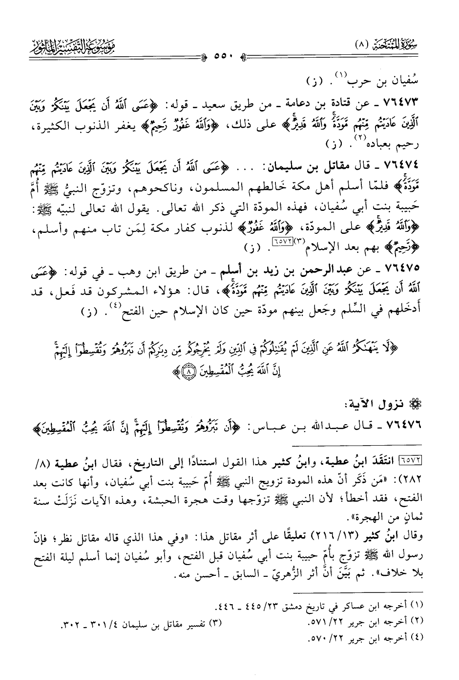 ٧٦٤٧٦ - قال عبد الله بن عباس: {أنْ تَبَرُّوهُمْ وتُقْسِطُوا إلَيْهِمْ إنَّ اللَّهَ يُحِبُّ المُقْسِطِينَ}