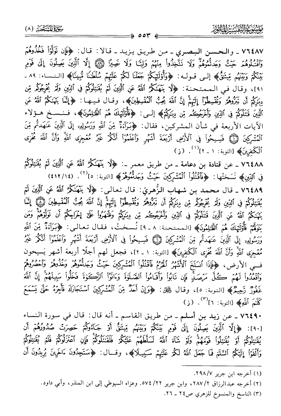 ٧٦٤٨٩ - قال محمد بن شهاب الزُّهريّ: قال تعالى: {لا ينهاكم الله عن الذين لم يقاتلوكم في الدين ولم يخرجوكم من دياركم أن تبروهم وتقسطوا إليهم إن الله يحب المقسطين إنما ينهاكم الله عن الذين قاتلوكم في الدين وأخرجوكم من دياركم وظاهروا على إخراجكم أن تولوهم ومن يتولهم فأولئك هم الظالمون} [الممتحنة: ٨ - ٩] نُسختْ، فقال تعالى: {براءة من الله ورسوله إلى الذين عاهدتم من المشركين فسيحوا في الأرض أربعة أشهر واعلموا أنكم غير معجزي الله وأن الله مخزي الكافرين} [التوبة: ١ - ٢]، فجعل لهم أجلًا أربعة أشهر يَسيحون في الأرض، {فإذا انسلخ الأشهر الحرم فاقتلوا المشركين حيث وجدتموهم وخذوهم واقعدوا لهم كل مرصد فإن تابوا وأقاموا الصلاة وآتوا الزكاة فخلوا سبيلهم إن الله غفور رحيم} [التوبة: ٥]، وقال - عز وجل -: {وإن أحد من المشركين استجارك فأجره حتى يسمع كلام الله} [التوبة: ٦] (¬٣). (ز)
