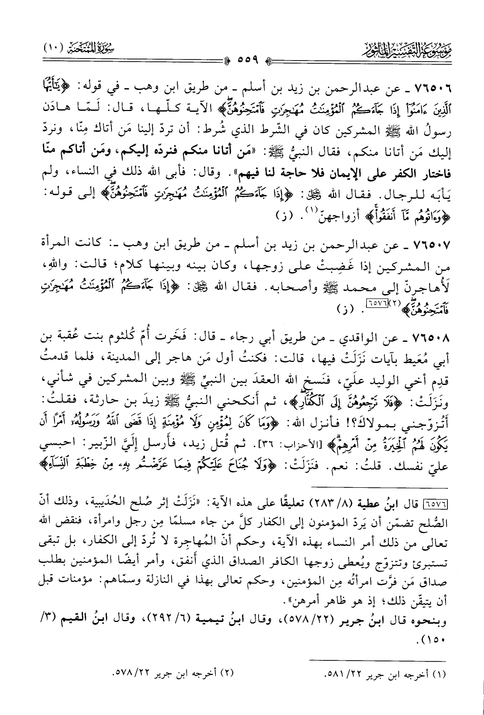 ٧٦٥٠٦ - عن عبد الرحمن بن زيد بن أسلم -من طريق ابن وهب- في قوله: {يا أيُّها الَّذِينَ آمَنُوا إذا جاءَكُمُ المُؤْمِناتُ مُهاجِراتٍ فامْتَحِنُوهُنَّ} الآية كلّها، قال: لَمّا هادَن رسولُ الله - صلى الله عليه وسلم - المشركين كان في الشّرط الذي شُرط: أن تردّ إلينا مَن أتاك مِنّا، ونردّ إليك مَن أتانا منكم، فقال النبيُّ - صلى الله عليه وسلم -: «مَن أتانا منكم فنردّه إليكم، ومَن أتاكم منّا فاختار الكفر على الإيمان فلا حاجة لنا فيهم». وقال: فأبى الله ذلك في النساء، ولم يَأبَه للرجال. فقال الله - عز وجل -: {إذا جاءَكُمُ المُؤْمِناتُ مُهاجِراتٍ فامْتَحِنُوهُنَّ} إلى قوله: {وآتُوهُمْ ما أنْفَقُوا} أزواجهنّ (¬١). (ز)