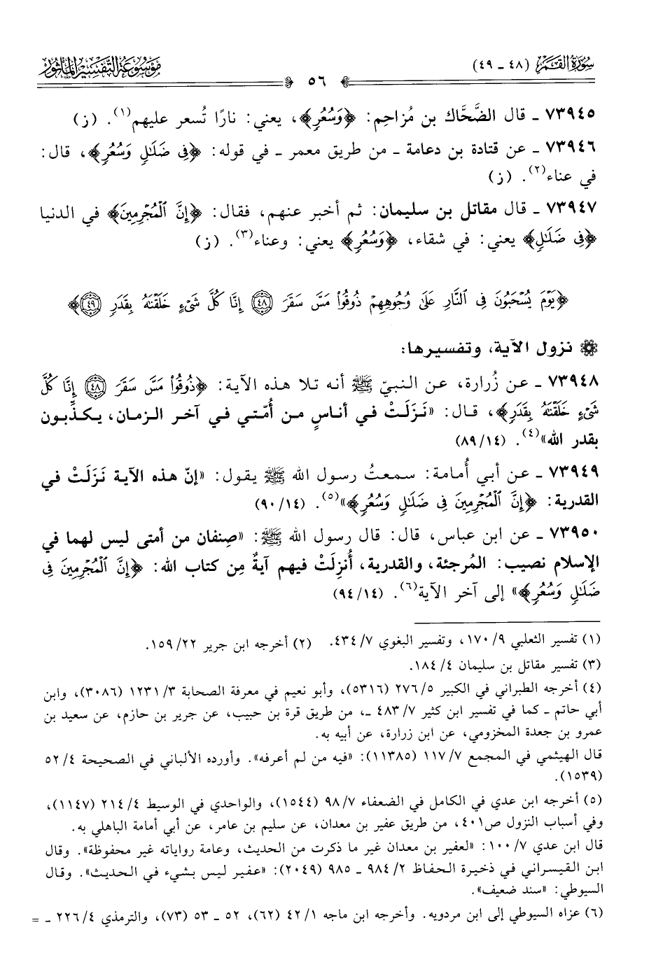 ٧٣٩٤٩ - عن أبي أُمامة: سمعتُ رسول الله - صلى الله عليه وسلم - يقول: «إنّ هذه الآية نَزَلَتْ في القدرية: {إنَّ المُجْرِمِينَ فِي ضَلالٍ وسُعُرٍ}» (¬٥). (١٤/ ٩٠)