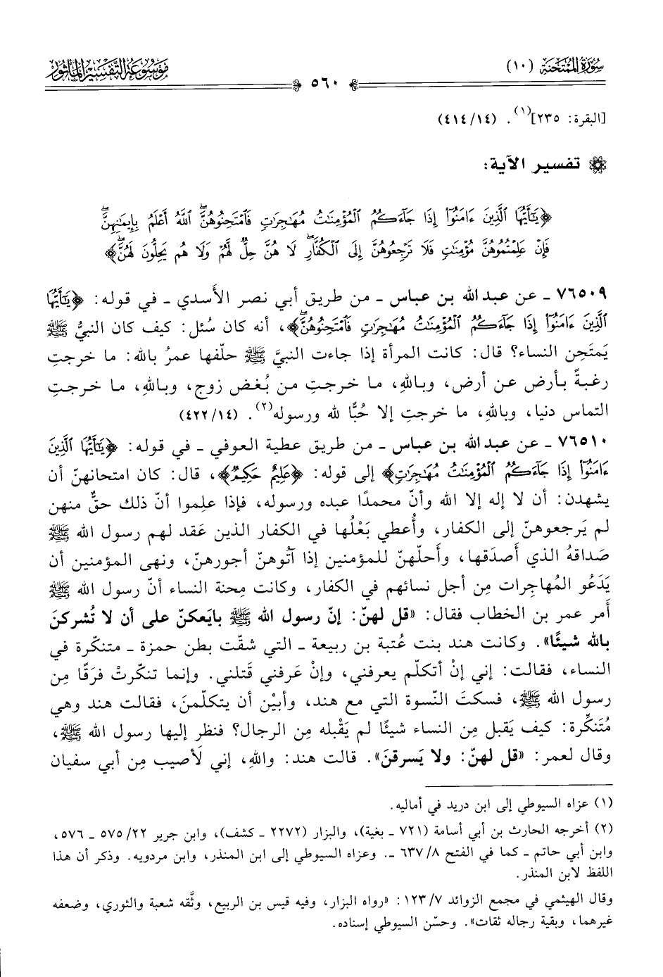 ٧٦٥١٠ - عن عبد الله بن عباس -من طريق عطية العوفي- في قوله: {يا أيُّها الَّذِينَ آمَنُوا إذا جاءَكُمُ المُؤْمِناتُ مُهاجِراتٍ} إلى قوله: {عليم حكيم}، قال: كان امتحانهنّ أن يشهدن: أن لا إله إلا الله وأنّ محمدًا عبده ورسوله، فإذا علِموا أنّ ذلك حقٌّ منهن لم يَرجعوهنّ إلى الكفار، وأُعطي بَعْلُها في الكفار الذين عَقد لهم رسول الله - صلى الله عليه وسلم - صَداقهُ الذي أصدَقها، وأَحلّهنّ للمؤمنين إذا آتُوهنّ أجورهنّ، ونهى المؤمنين أن يَدَعُو المُهاجِرات مِن أجل نسائهم في الكفار، وكانت مِحنة النساء أنّ رسول الله - صلى الله عليه وسلم - أمر عمر بن الخطاب فقال: «قل لهنّ: إنّ رسول الله - صلى الله عليه وسلم - بايَعكنّ على أن لا تُشركنَ بالله شيئًا». وكانت هند بنت عُتبة بن ربيعة -التي شقّت بطن حمزة- متنكّرة في النساء، فقالت: إني إنْ أتكلّم يعرفني، وإنْ عَرفني قَتلني. وإنما تنكّرتْ فرَقًا مِن رسول الله - صلى الله عليه وسلم -، فسكتَ النّسوة التي مع هند، وأبيْن أن يتكلّمنَ، فقالت هند وهي مُتَنكِّرة: كيف يَقبل مِن النساء شيئًا لم يَقْبله مِن الرجال؟ فنظر إليها رسول الله - صلى الله عليه وسلم -، وقال لعمر: «قل لهنّ: ولا يَسرقنَ». قالت هند: واللهِ، إني لَأصيب مِن أبي سفيان