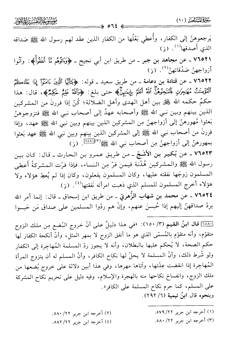 ٧٦٥٢٢ - عن قتادة بن دعامة -من طريق سعيد- قوله: {يا أيها الذين آمنوا إذا جاءكم المؤمنات مهاجرات فامتحنوهن الله أعلم بإيمانهن} حتى بلغ: {والله عليم حكيم}، قال: هذا حكمٌ حكمه الله - عز وجل - بين أهل الهدى وأهل الضلالة؛ كُنّ إذا فررنَ من المشركين الذين بينهم وبين نبي الله - صلى الله عليه وسلم - وأصحابه عهدٌ إلى أصحاب نبي الله - صلى الله عليه وسلم - فتزوجوهنّ بَعثوا مُهورهنّ إلى أزواجهنّ مِن المشركين الذين بينهم وبين نبي الله - صلى الله عليه وسلم - عهد، وإذا فررنَ من أصحاب نبي الله - صلى الله عليه وسلم - إلى المشركين الذين بينهم وبين نبي الله - صلى الله عليه وسلم - عهد بَعثوا بمهورهنّ إلى أزواجهنّ مِن أصحاب نبي الله - صلى الله عليه وسلم - (¬٣) [٦٥٨٠]. (ز)
