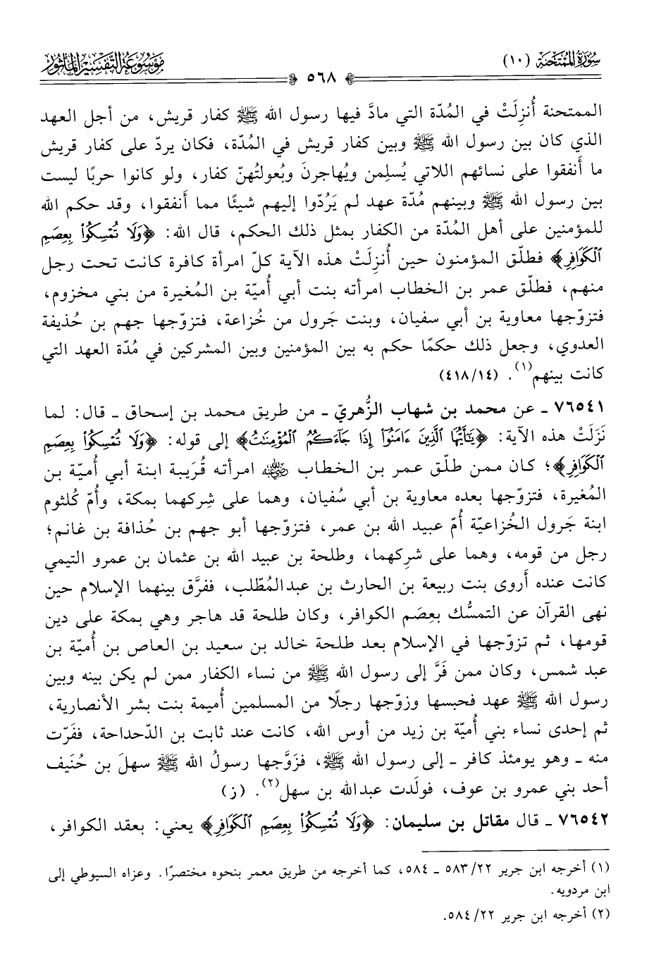 ٧٦٥٤١ - عن محمد بن شهاب الزُّهريّ -من طريق محمد بن إسحاق- قال: لما نَزَلَتْ هذه الآية: {يا أيها الذين آمنوا إذا جاءكم المؤمنات} إلى قوله: {ولا تمسكوا بعصم الكوافر}؛ كان ممن طلّق عمر بن الخطاب? امرأته قُرَيبة ابنة أبي أُميّة بن المُغيرة، فتزوّجها بعده معاوية بن أبي سُفيان، وهما على شِركهما بمكة، وأُمّ كُلثوم ابنة جَرول الخُزاعيّة أُمّ عبيد الله بن عمر، فتزوّجها أبو جهم بن حُذافة بن غانم؛ رجل من قومه، وهما على شرِكهما، وطلحة بن عبيد الله بن عثمان بن عمرو التيمي كانت عنده أروى بنت ربيعة بن الحارث بن عبد المُطّلب، ففرَّق بينهما الإسلام حين نهى القرآن عن التمسُّك بعِصَم الكوافر، وكان طلحة قد هاجر وهي بمكة على دين قومها، ثم تزوّجها في الإسلام بعد طلحة خالد بن سعيد بن العاص بن أُميّة بن عبد شمس، وكان ممن فَرَّ إلى رسول الله - صلى الله عليه وسلم - من نساء الكفار ممن لم يكن بينه وبين رسول الله - صلى الله عليه وسلم - عهد فحبسها وزوّجها رجلًا من المسلمين أُميمة بنت بشر الأنصارية، ثم إحدى نساء بني أُميّة بن زيد من أوس الله، كانت عند ثابت بن الدّحداحة، ففَرّت منه -وهو يومئذ كافر- إلى رسول الله - صلى الله عليه وسلم -، فزَوَّجها رسولُ الله - صلى الله عليه وسلم - سهلَ بن حُنَيف أحد بني عمرو بن عوف، فولَدت عبد الله بن سهل (¬٢). (ز)