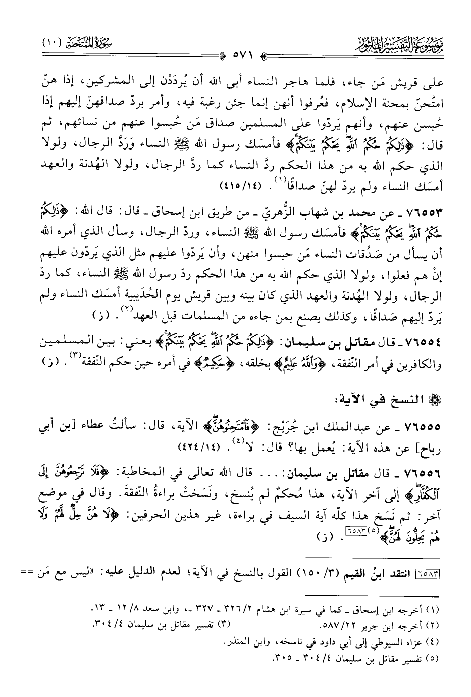 [٦٥٨٣] انتقد ابنُ القيم (٣/ ١٥٠) القول بالنسخ في الآية؛ لعدم الدليل عليه: «ليس مع مَن ادعى نَسْخها حُجّة ألبتة؛ فإنّ الشرط الذي وقع بين النبي - صلى الله عليه وسلم - وبين الكفار في ردّ مَن جاءه مسلمًا إليهم إن كان مختصًا بالرجال لم تدخل النساء فيه، وإن كان عامًّا للرجال والنساء فالله? خصّص منه ردّ النساء ونهاهم عن ردهنّ، وأمرهم بردّ مهورهنّ، وأن يَردّوا منها على مَن ارتدت امرأته إليهم من المسلمين المهر الذي أعطاها، ثم أخبر أنّ ذلك حكمه الذي يحكم به بين عباده، وأنه صادر عن عِلْمه وحِكمته، ولم يأت عنه ما ينافي هذا الحكم، ويكون بعده حتى يكون ناسخًا».