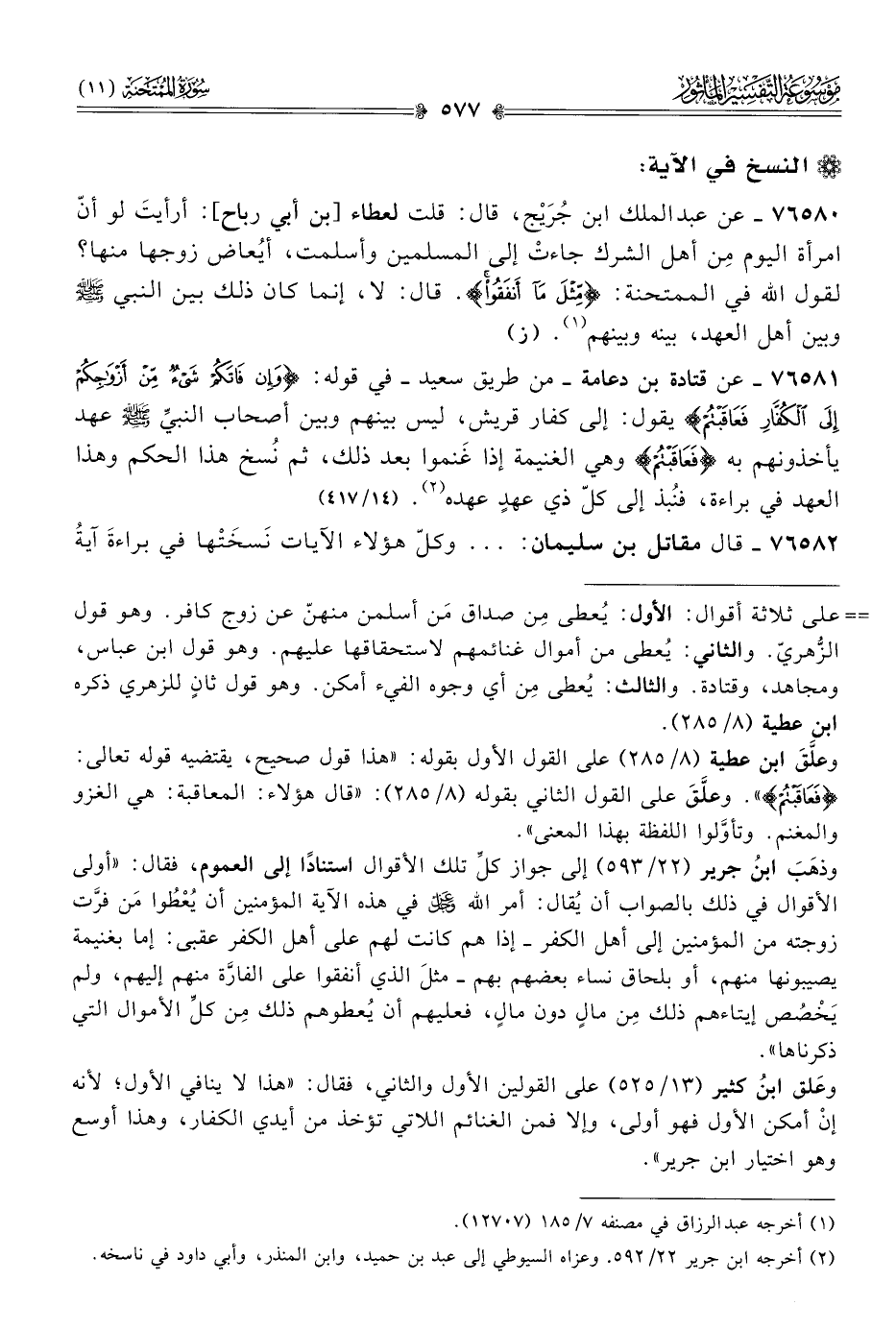 ٧٦٥٨١ - عن قتادة بن دعامة -من طريق سعيد- في قوله: {وإنْ فاتَكُمْ شَيْءٌ مِن أزْواجِكُمْ إلى الكُفّارِ فَعاقَبْتُمْ} يقول: إلى كفار قريش، ليس بينهم وبين أصحاب النبيِّ - صلى الله عليه وسلم - عهد يأخذونهم به {فَعاقَبْتُمْ} وهي الغنيمة إذا غَنموا بعد ذلك، ثم نُسخ هذا الحكم وهذا العهد في براءة، فنُبذ إلى كلّ ذي عهدٍ عهده (¬٢). (١٤/ ٤١٧)