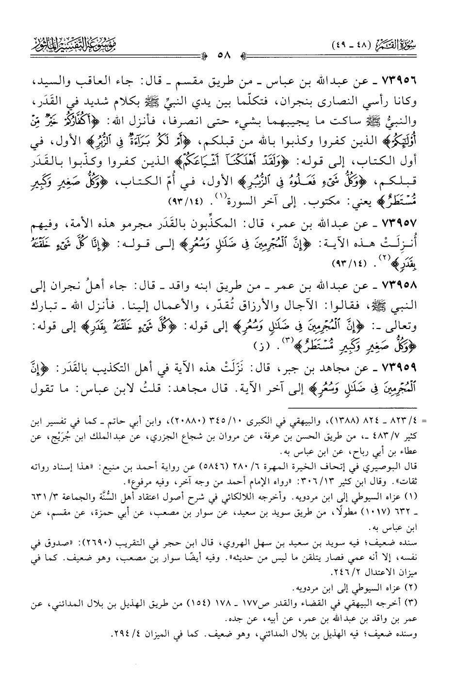 ٧٣٩٥٨ - عن عبد الله بن عمر -من طريق ابنه واقد- قال: جاء أهلُ نجران إلى النبي - صلى الله عليه وسلم -، فقالوا: الآجال والأرزاق تُقدّر، والأعمال إلينا. فأنزل الله -تبارك وتعالى-: {إن المجرمين في ضلال وسعر} إلى قوله: {كل شيء خلقناه بقدر} إلى قوله: {وكل صغير وكبير مستطر} (¬٣). (ز)