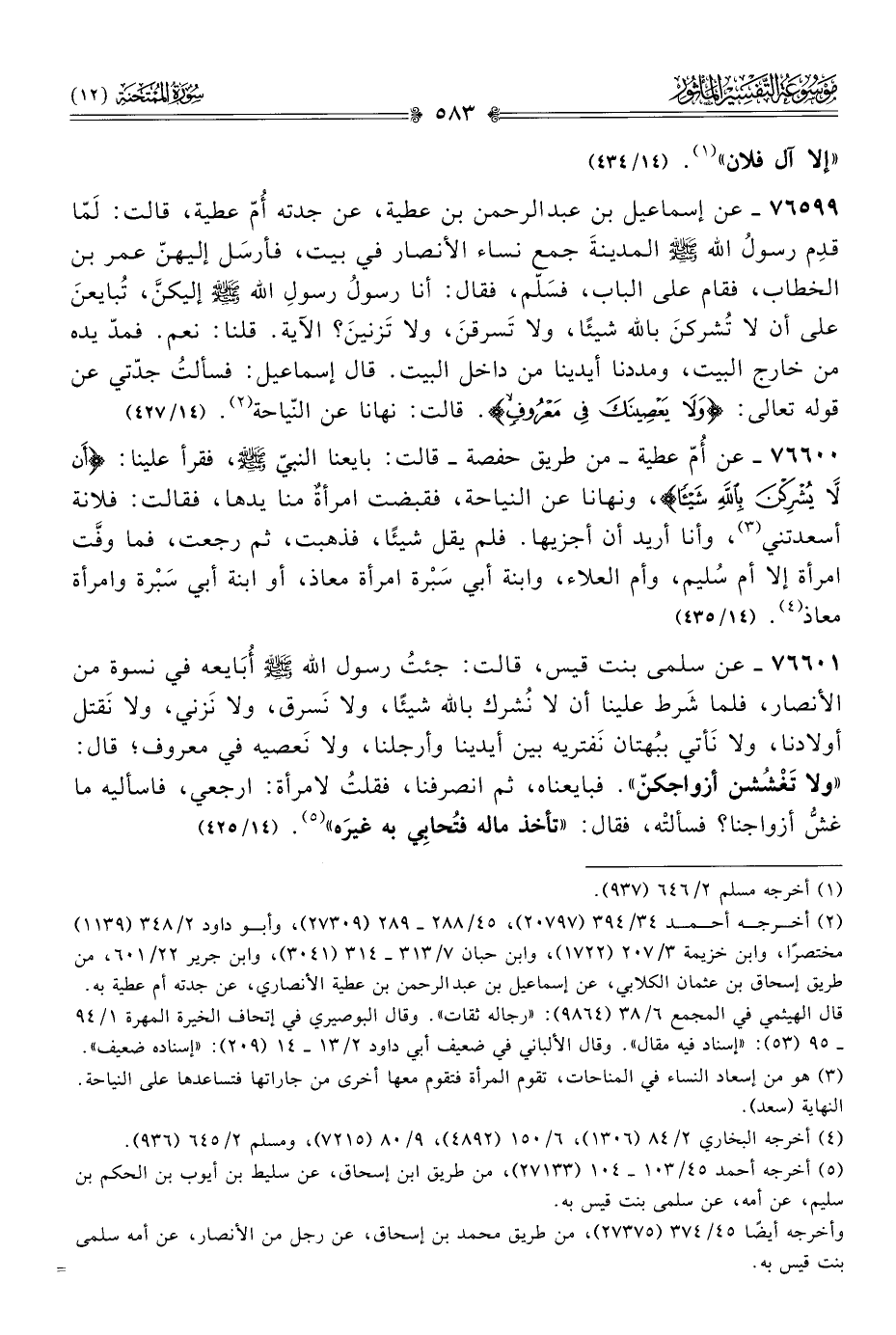 ٧٦٦٠٠ - عن أُمّ عطية -من طريق حفصة- قالت: بايعنا النبيّ - صلى الله عليه وسلم -، فقرأ علينا: {أن لا يشركن بالله شيئا}، ونهانا عن النياحة، فقبضت امرأةٌ منا يدها، فقالت: فلانة أسعدتني (¬٣)، وأنا أريد أن أجزيها. فلم يقل شيئًا، فذهبت، ثم رجعت، فما وفَّت امرأة إلا أم سُليم، وأم العلاء، وابنة أبي سَبْرة امرأة معاذ، أو ابنة أبي سَبْرة وامرأة معاذ (¬٤). (١٤/ ٤٣٥)