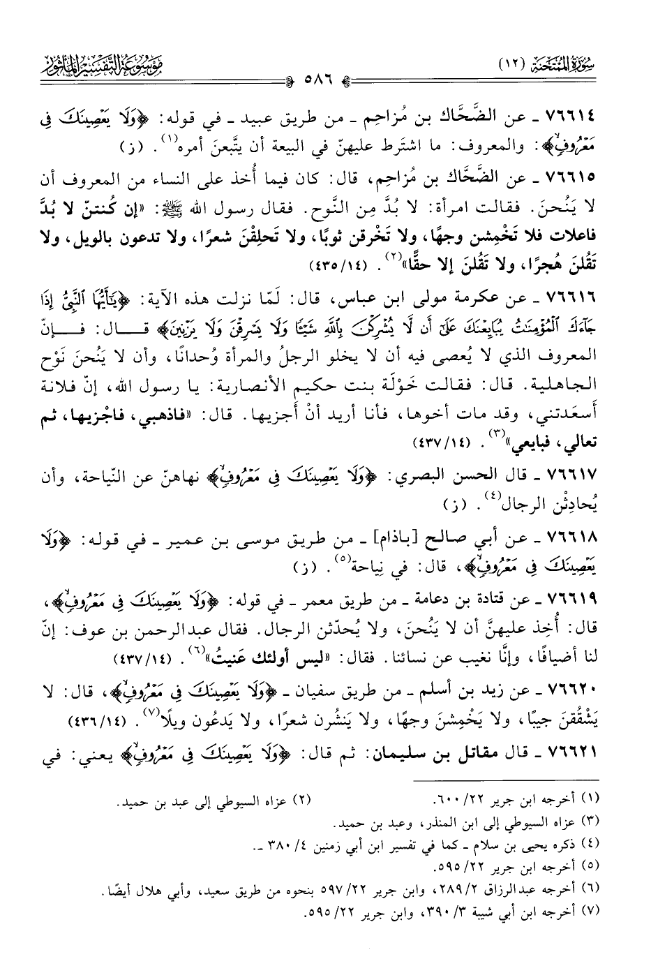 ٧٦٦٢٠ - عن زيد بن أسلم -من طريق سفيان- {ولا يَعْصِينَكَ فِي مَعْرُوفٍ}، قال: لا يَشْقُقنَ جيبًا، ولا يَخْمِشنَ وجهًا، ولا يَنشُرن شعرًا، ولا يَدعُون ويلًا (¬٧). (١٤/ ٤٣٦)