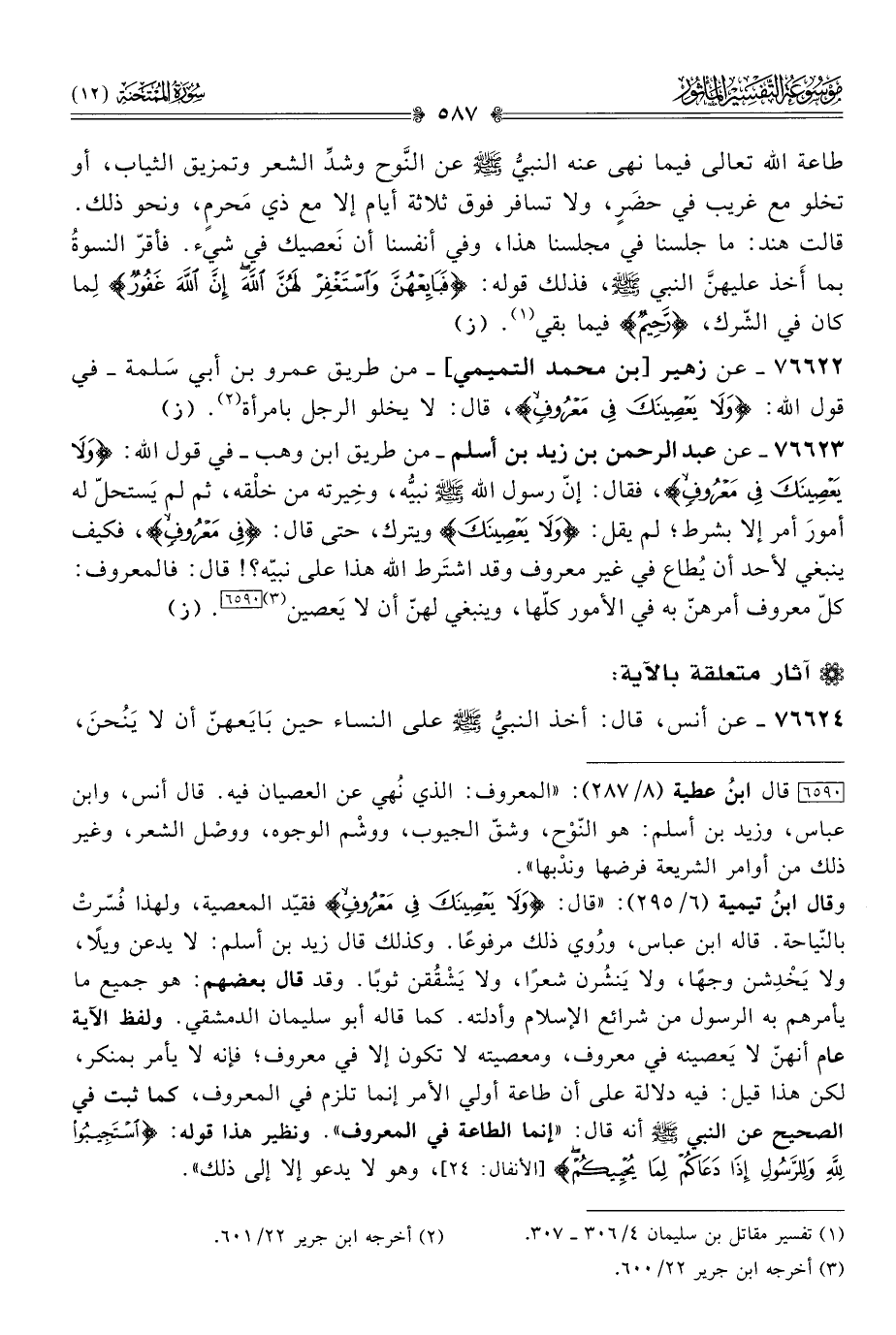 ٧٦٦٢٣ - عن عبد الرحمن بن زيد بن أسلم -من طريق ابن وهب- في قول الله: {ولا يَعْصِينَكَ فِي مَعْرُوفٍ}، فقال: إنّ رسول الله - صلى الله عليه وسلم - نبيُّه، وخِيرته من خلْقه، ثم لم يَستحلّ له أمورَ أمر إلا بشرط؛ لم يقل: {ولا يَعصينك} ويترك، حتى قال: {في معروف}، فكيف ينبغي لأحد أن يُطاع في غير معروف وقد اشتَرط الله هذا على نبيّه؟! قال: فالمعروف: كلّ معروف أمرهنّ به في الأمور كلّها، وينبغي لهنّ أن لا يَعصين (¬٣) [٦٥٩٠]. (ز)