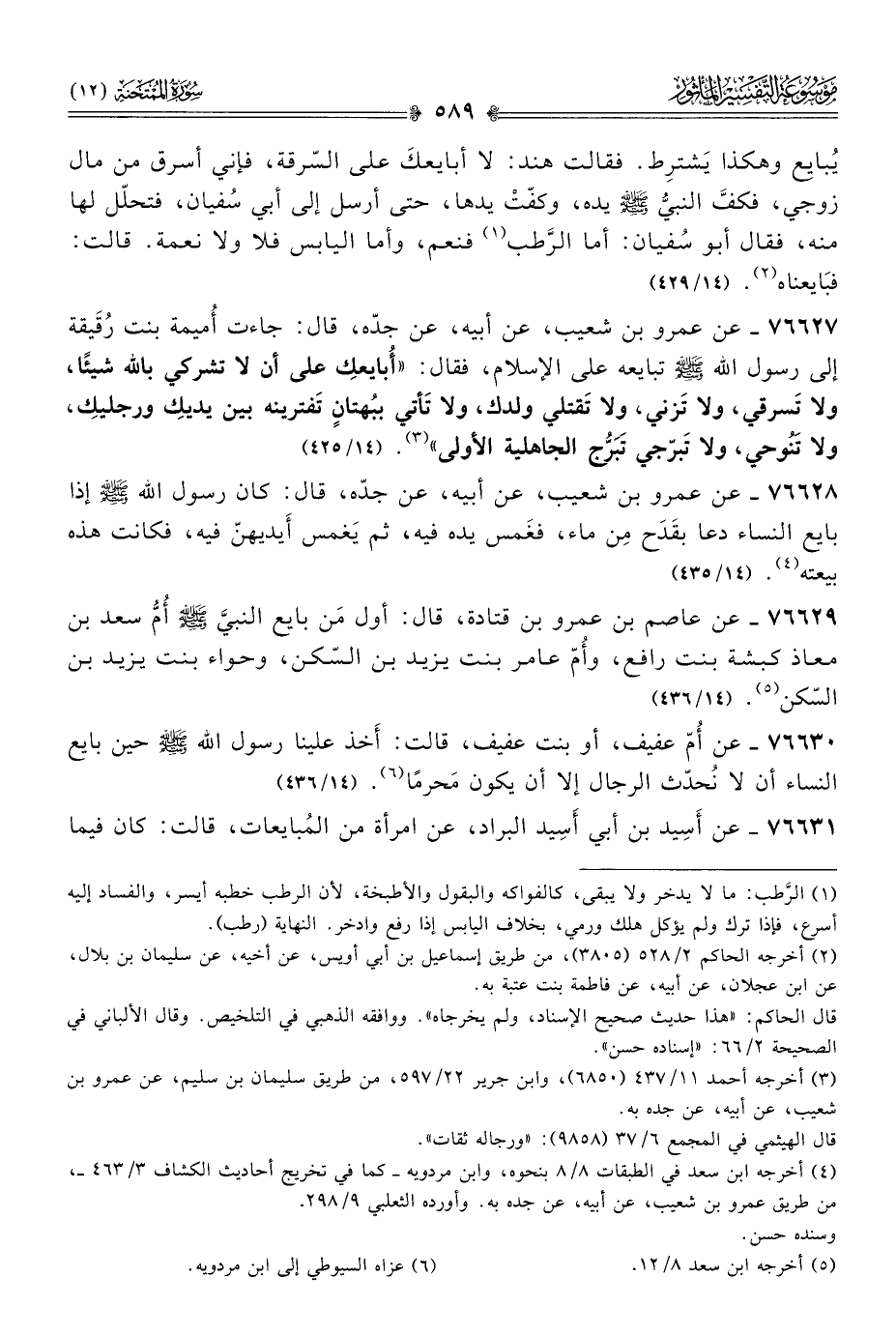 ٧٦٦٢٧ - عن عمرو بن شعيب، عن أبيه، عن جدّه، قال: جاءت أُميمة بنت رُقَيقة إلى رسول الله - صلى الله عليه وسلم - تبايعه على الإسلام، فقال: «أُبايعكِ على أن لا تشركي بالله شيئًا، ولا تَسرقي، ولا تَزني، ولا تَقتلي ولدك، ولا تَأتي ببُهتانٍ تَفترينه بين يديكِ ورجليكِ، ولا تَنُوحي، ولا تَبرّجي تَبَرُّج الجاهلية الأولى» (¬٣). (١٤/ ٤٢٥)